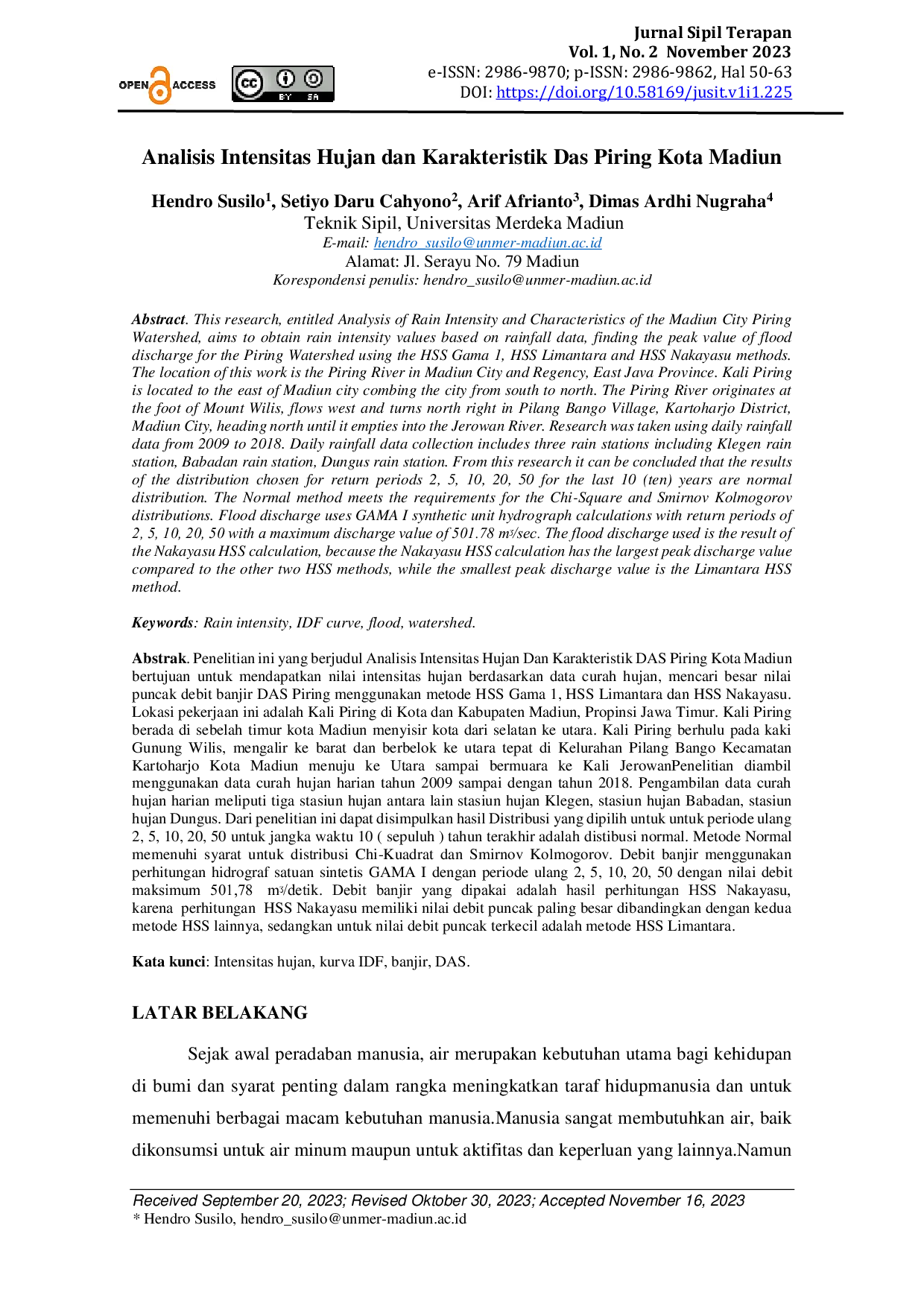 Distribusi yang paling sesuai untuk analisis frekuensi hujan di DAS Piring adalah distribusi normal, karena memenuhi syarat uji Chi-Kuadrat dan Smirnov-Kolmogorov.Debit banjir rencana paling tinggi dihitung menggunakan metode HSS Nakayasu, dengan nilai debit puncak sebesar 561,85 m³/detik untuk periode ulang 50 tahun, menjadikannya metode yang paling konservatif untuk perencanaan.Karakteristik fisik DAS Piring meliputi luas 77,18 km², bentuk memanjang, pola aliran dentritik, serta didominasi oleh tutupan lahan berupa hutan dan sawah irigasi.