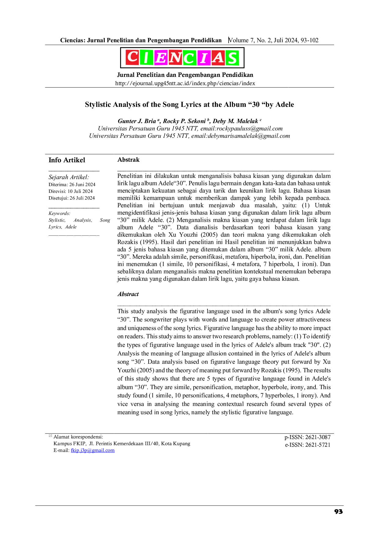 Ciencias : Jurnal Penelitian dan Pengembangan PendidikanCiencias : Jurnal Penelitian dan Pengembangan PendidikanPenelitian ini dilakukan untuk menganalisis bahasa kiasan yang digunakan dalam lirik lagu album Adele 30. Penulis lagu bermain dengan kata-kata dan bahasa untuk menciptakan kekuatan sebagai daya tarik dan keunikan lirik lagu. Bahasa kiasan memiliki kemampuan untuk memberikan dampak yang lebih kepada pembaca. Penelitian ini bertujuan untuk menjawab dua masalah, yaitu: (1) Mengidentifikasi jenis-jenis bahasa kiasan yang digunakan dalam lirik lagu album 30 milik Adele. (2) Menganalisis makna kiasan yang terdapat dalam lirik lagu album Adele 30. Data dianalisis berdasarkan teori bahasa kiasan yang dikemukakan oleh Xu Youzhi (2005) dan teori makna yang dikemukakan oleh Rozakis (1995). Hasil penelitian ini menunjukkan bahwa ada 5 jenis bahasa kiasan yang ditemukan dalam album 30 milik Adele. Mereka adalah simile, personifikasi, metafora, hiperbola, dan ironi. Penelitian ini menemukan (1 simile, 10 personifikasi, 4 metafora, 7 hiperbola, 1 ironi). Dalam menganalisis makna, penelitian kontekstual menemukan beberapa jenis makna yang digunakan dalam lirik lagu, yaitu gaya bahasa kiasan.