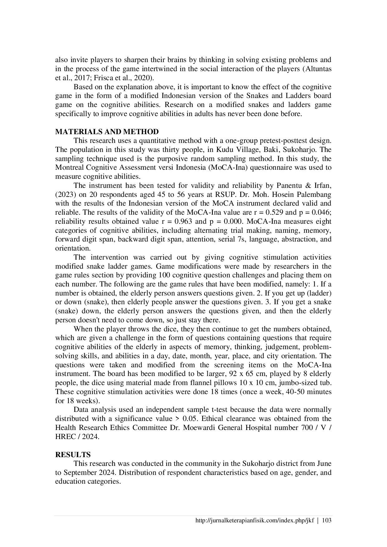 Jurnal Keterapian FisikJurnal Keterapian FisikLansia mengalami penurunan fisik, mental, sosial, serta fungsi kognitif akibat proses penuaan. Untuk mempertahankan kemampuan kognitif, diperlukan intervensi berupa aktivitas kognitif. Penelitian ini bertujuan untuk mengetahui pengaruh permainan kognitif berupa board game ular tangga versi Indonesia yang dimodifikasi terhadap kemampuan kognitif pada lansia. Penelitian menggunakan metode kuantitatif dengan desain pre-eksperimental satu kelompok pre-test post-test. Teknik pengambilan sampel menggunakan purposive sampling dengan jumlah sampel tiga puluh orang. Instrumen yang digunakan adalah MoCA-Ina. Intervensi permainan ular tangga versi Indonesia yang dimodifikasi dilaksanakan dalam 8 sesi selama 18 minggu. Analisis data menggunakan uji t dependen. Hasil penelitian menunjukkan bahwa karakteristik sampel didominasi lansia perempuan dengan tingkat pendidikan akhir sekolah dasar sebanyak 14 orang. Hasil uji t menunjukkan nilai Sig. (2-tailed) = 0,000 (p < 0,05), yang berarti terdapat pengaruh permainan kognitif berupa board game ular tangga versi Indonesia yang dimodifikasi terhadap kemampuan kognitif.