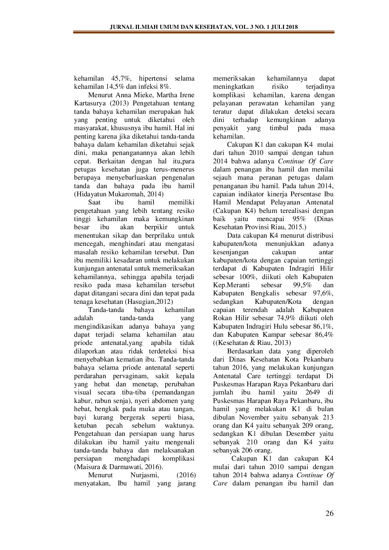 Jakiyah : Jurnal Ilmiah Umum dan Kesehatan AisyiyahJakiyah : Jurnal Ilmiah Umum dan Kesehatan AisyiyahLatar Belakang: Angka kesakitan dan kematian ibu merupakan masalah yang sangat besar bagi kesehatan terutama bagi negara-negara berkembang. Faktor penyebab angka kematian dan kesakitan ibu salah satunya karena tidak terdeteksinya tanda bahaya selama kehamilan karena kunjungan ANC yang tidak teratur. Metode Penelitian: Jenis penelitian kuantitatif dengan survey analisis korelasi, desain penelitian cross sectional. Populasi seluruh ibu primigravida trimester III yang melakukan kunjungan ANC di Puskesmas Harapan Raya Pekanbaru. Teknik pengambilan sampel consecutive sampling jumlah sampel 122 orang. Menggunakan data primer. Penelitian dilaksanakan di Puskesmas Harapan Raya Pekanbaru bulan September sampai bulan Mei 2017. Instrumen penelitian menggunakan kuesioner. Analisa data Univariat dan Bivariat. Hasil: Hasil analisa univariat yaitu mayoritas responden dengan kategori pengetahuan cukup yaitu 78 orang (63,9%), minoritas responden dengan pengetahuan baik yaitu 12 orang (9,8%), mayoritas responden dengan kunjungan ANC yang tidak lengkap sebanyak 68 orang (55,7%) dan minoritas dengan kategori lengkap melakukan kunjungan ANC sebanyak 54 orang (44,3%). Adapun hasil analisa secara bivariat didapatkan hasil α (0,05) > p-value(0,03). Simpulan: terdapat hubungan antara pengetahuan ibu primigravida tentang tanda bahaya kehamilan dengan kunjungan ANC terintegrasi di Puskesmas Harapan Raya Pekanbaru. Disarankan bagi tempat penelitian agar terus meningkatkan pelayanan khusus pada ibu hamil dan melaksanakan dengan baik pelayanan ANC terintegrasi tersebut.