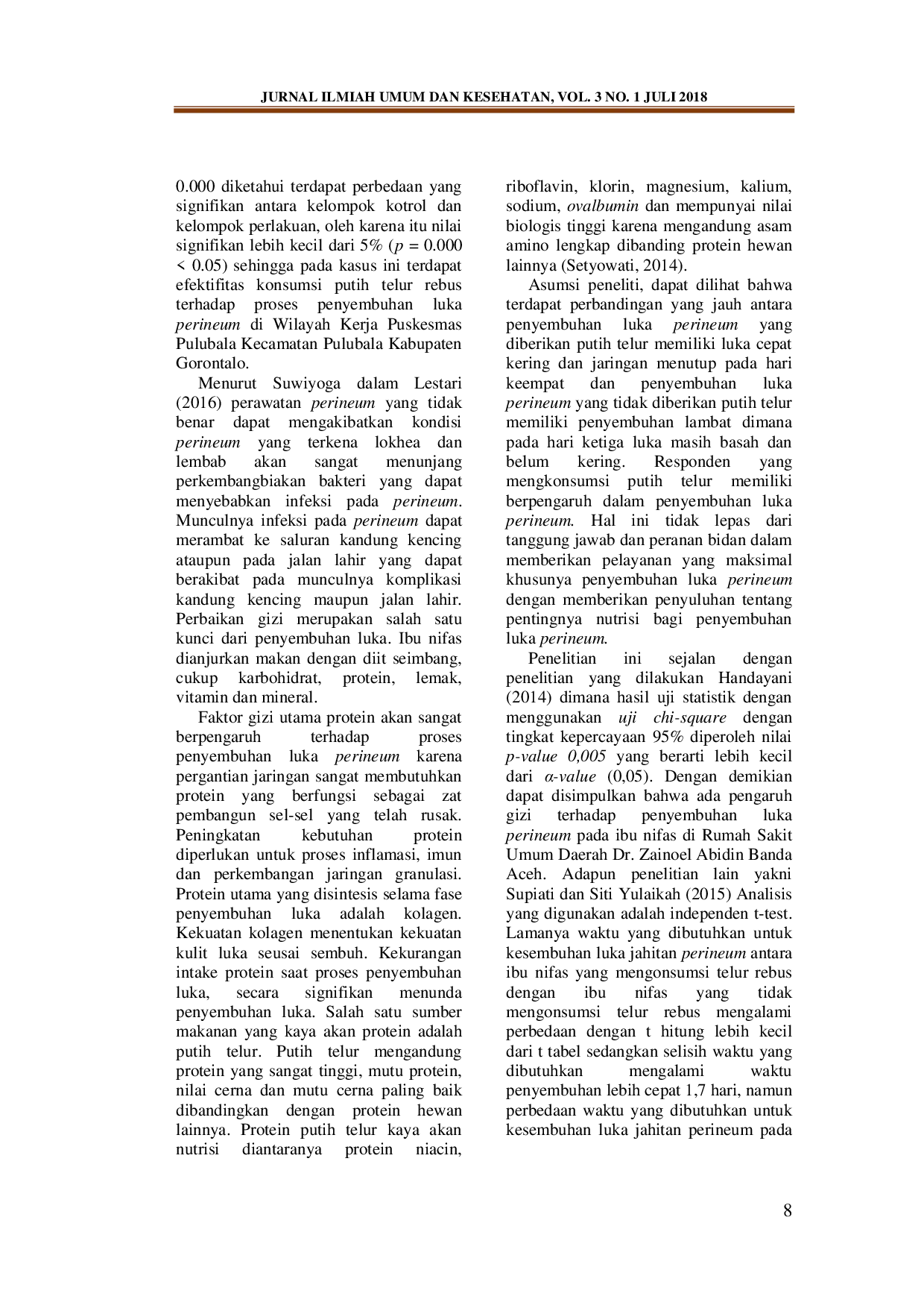 Jakiyah : Jurnal Ilmiah Umum dan Kesehatan AisyiyahJakiyah : Jurnal Ilmiah Umum dan Kesehatan AisyiyahPenelitian ini dilakukan di Wilayah Puskesmas Pulubala Kecamatan Pulubala Kabupaten Gorontalo. Tujuan penelitian ini untuk mengetahui efektifitas konsumsi putih telur rebus terhadap proses penyembuhan luka perineum. Penelitian ini termasuk jenis penelitian survei analitik dengan rancangan penelitian eksperimen. Subjek penelitian ini yaitu semua ibu bersalin dengan ruptur perineum pada tahun 2018 berjumlah 34 orang. Berdasarkan hasil uji statistik menggunakan chi square dengan α=0,05 diperoleh p = 0.000 yang artinya ada efektifitas konsumsi putih telur terhadap proses penyembuhan luka perineum di Puskesmas Pulubala Kecamatan Pulubala Kabupaten Gorontalo.