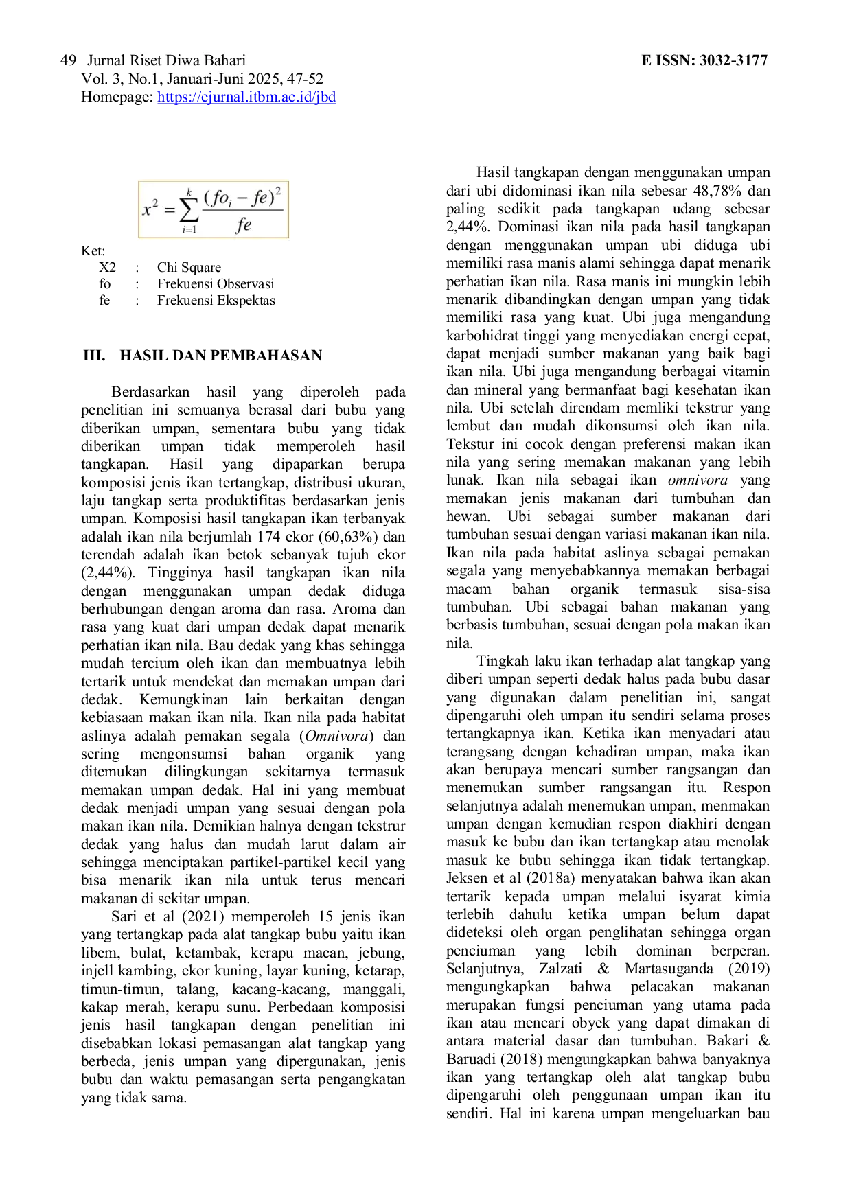 Penggunaan umpan pada alat tangkap bubu memberikan hasil tangkapan yang signifikan, dengan dedak sebagai umpan paling produktif.Umpan jagung menghasilkan ukuran ikan terbesar, sementara umpan dedak memberikan laju tangkap tertinggi.Analisis statistik mengindikasikan semua jenis umpan layak digunakan, tetapi pilihan umpan perlu mempertimbangkan lokasi penangkapan dan biaya operasional.