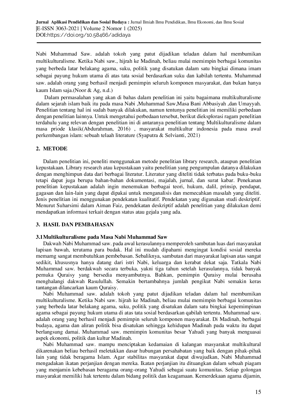 ADIDAYA : Aplikasi Pendidikan dan Sosial BudayaADIDAYA : Aplikasi Pendidikan dan Sosial BudayaPenelitian ini bertujuan untuk mengetahui bagaimana baik itu pada masa Nabi ,Muhammad Saw,Masa Bani Abbasiyah ,dan Umayyah. Metode penelitian yang digunakan yaitu penelitian library research, ataupun penelitian kepustakaan. Library research atau kepustakaan yaitu penelitian yang pengumpulan datanya dilakukan dengan menghimpun data dari berbagai literatur. Literatur yang diteliti tidak terbatas pada buku-buku tetapi dapat juga berupa bahan-bahan dokumentasi, majalah, jurnal, dan surat kabar. Hasil penelitian ini yaitu . Multikulturalisme mulai berkembang melewati batasan keragaman pada masyarakat Arab asli, keragaman kultur ini terjadi karena adanya hubungan antara budaya luar Islam dan luar budaya Arab. Pada masa pemerintahan Dinasti Abbasiyah kebudayaan Islam bertemu dengan kebudayaan Arab, Persia, Romawi, juga kebudayaan India.