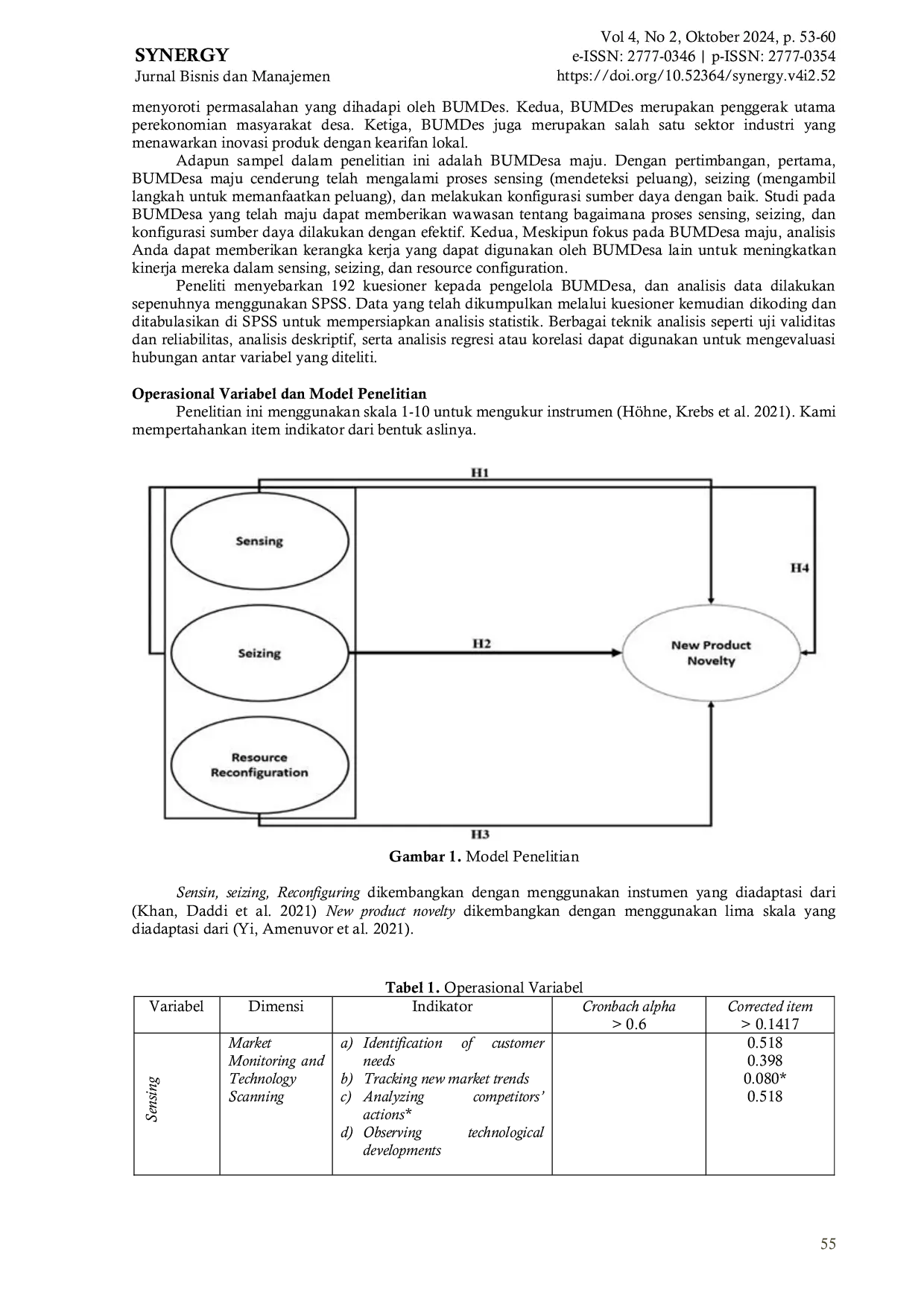 SYNERGY: Jurnal Bisnis dan ManajemenSYNERGY: Jurnal Bisnis dan ManajemenKemampuan dinamis—meliputi sensing, seizing, dan reconfiguring—menjadi kunci keberhasilan inovasi produk pada Badan Usaha Milik Desa (BUMDesa) Indonesia, namun literatur terbatas untuk konteks usaha pedesaan. Penelitian ini secara kuantitatif menguji pengaruh ketiga kemampuan tersebut terhadap kebaruan produk baru. Hasilnya menunjukkan sensing dan reconfiguring berdampak signifikan, sedangkan seizing tidak berpengaruh karena keterbatasan sumber daya dan orientasi solusi lokal. Sensing memungkinkan BUMDesa mendeteksi peluang dan ancaman pasar, reconfiguring memberi fleksibilitas organisasi serta adopsi teknologi baru, sedangkan seizing perlu penyesuaian kontekstual. Penelitian memperkaya teori kemampuan dinamis di lingkungan bisnis pedesaan.