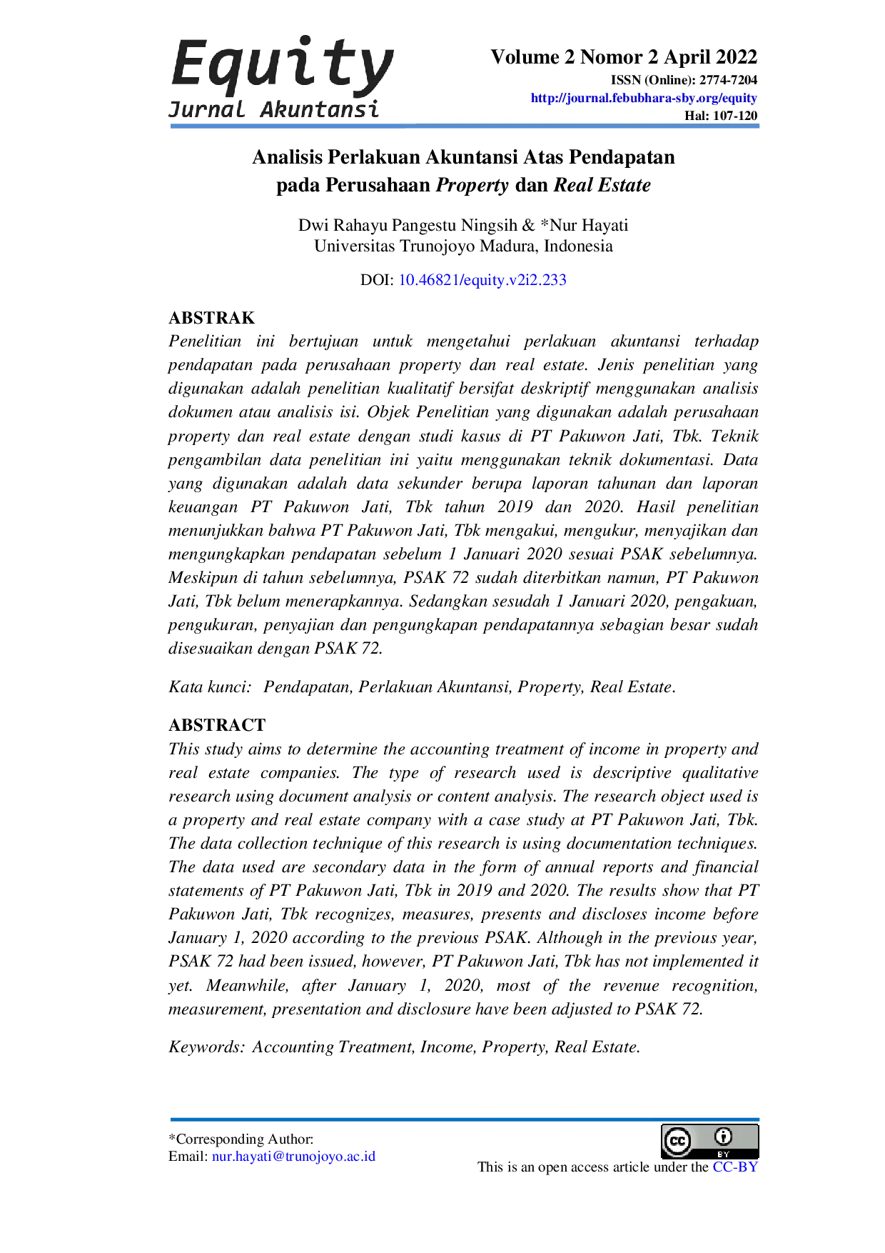 - Analisis Perlakuan Akuntansi Atas Pendapatan pada Perusahaan Property dan Real Estate | Equity: Jurnal... journal.febubhara-sby.org/index.php/equity/article/view/233Analisis Perlakuan Akuntansi Atas Pendapatan pada Perusahaan Property dan Real Estate Equity Jurnal journal febubhara sby index php equity article view 233
