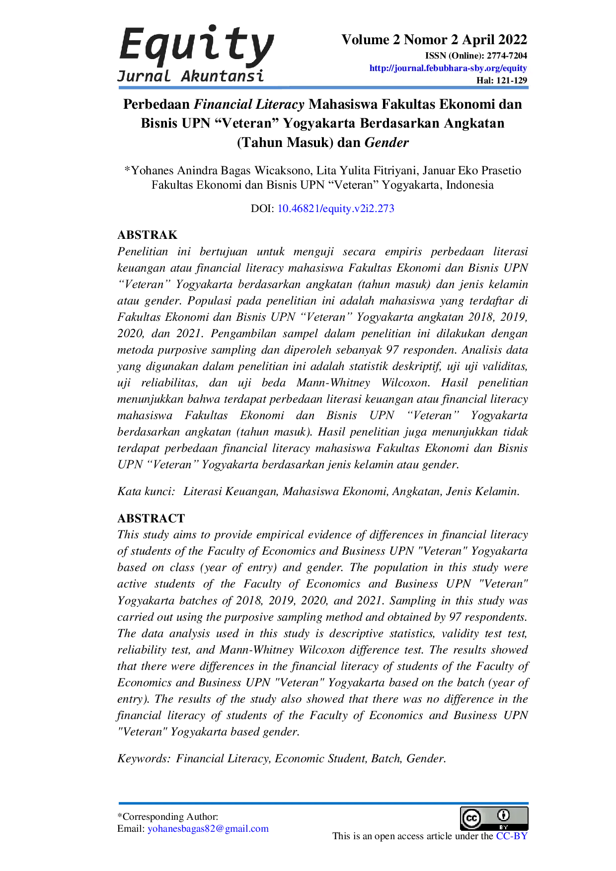 - Perbedaan Financial Literacy Mahasiswa Fakultas Ekonomi dan Bisnis UPN “Veteranâ€... journal.febubhara-sby.org/index.php/equity/article/view/273Perbedaan Financial Literacy Mahasiswa Fakultas Ekonomi dan Bisnis UPN yCeVeteranyCAy journal febubhara sby index php equity article view 273