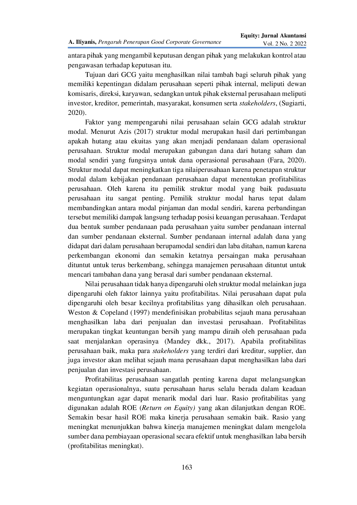 Equity: Jurnal AkuntansiEquity: Jurnal AkuntansiPeneliti ini memiliki tujuan untuk menganalisis dan menguji pengaruh Good Corporate Governance (GCG), struktur modal, profitabilitas terhadap nilai perusahaan. Jenis penelitian ini yaitu penelitian kuantitatif. Populasi dalam penelitian ini adalah perusahaan Property dan Real Estate yang terdaftar di Bursa Efek Indonesia (BEI) pada tahun 2018-2020, yang berjumlah 65 Perusahaan. Pengambilan sampel menggunakan Purposive Sampling, dan berdasarkan kriteria yang diterapkan diperoleh sebanyak 15 perusahaan. Sumber data yang digunakan merupakan laporan keuangan dan annual report. Metode yang digunakan untuk menganalisis data yaitu analisis Regresi Linier Berganda, dengan uji F dan uji t yang dibantu dengan program SPSS (Statictical Product and Service Solution). Hasil dari penelitian ini menunjukan bahwa (1) Good Corporate Governance (GCG), struktur modal, profitabilitas berpengaruh seara simultan terhadap nilai perusahaan (Tobins Q); (2) berdasarkan hasil uji t yang telah dilakukan, diantara variabel Good Corporate Governance (GCG), struktur modal, profitabilitas yang berpegaruh paling dominan terhadap nilai perusahaan (TobinsQ) adalah Good Corporate Governance (GCG).
