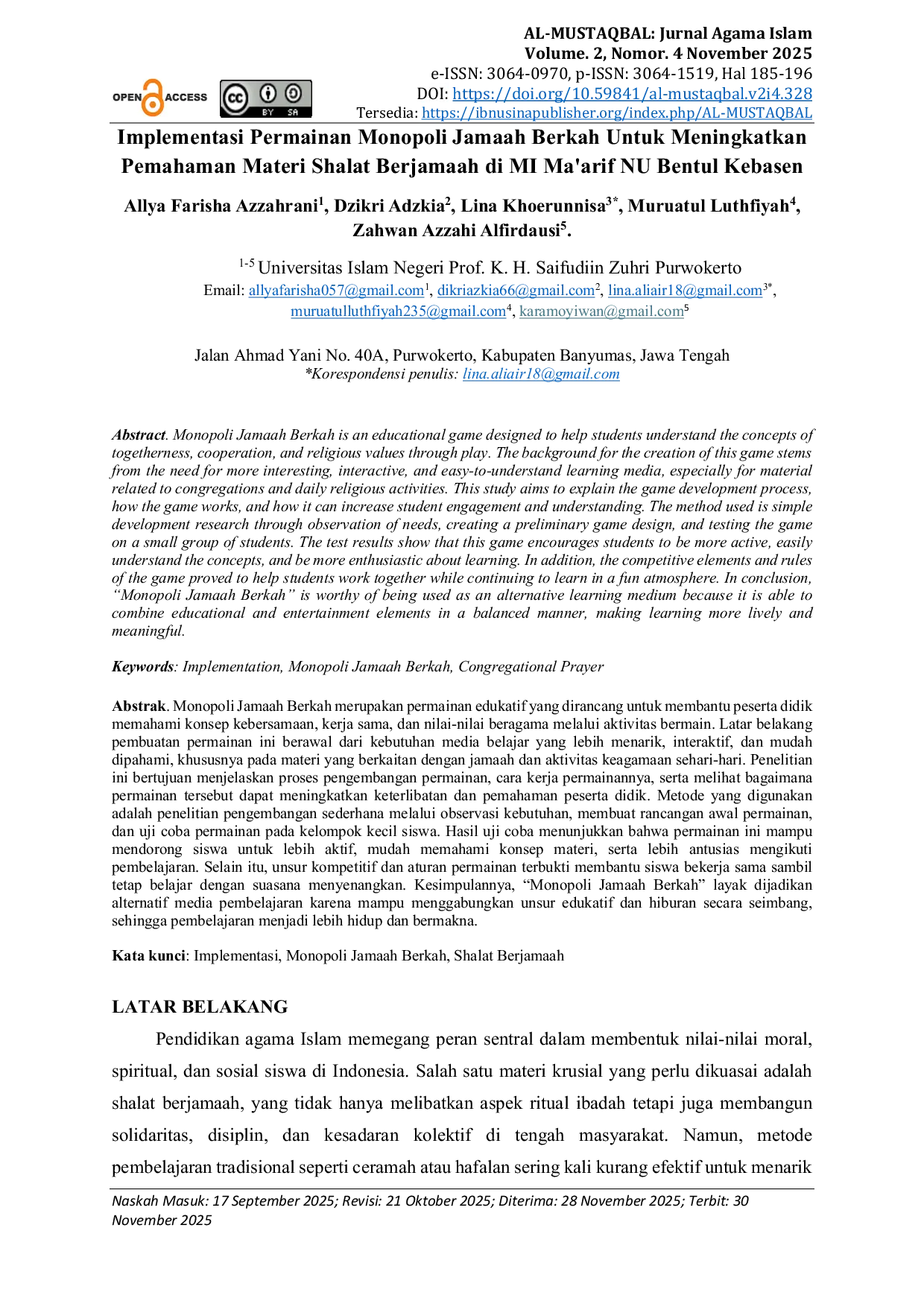 AL-MUSTAQBAL: Jurnal Agama IslamAL-MUSTAQBAL: Jurnal Agama IslamMonopoli Jamaah Berkah merupakan permainan edukatif yang dirancang untuk membantu peserta didik memahami konsep kebersamaan, kerja sama, dan nilai-nilai beragama melalui aktivitas bermain. Latar belakang pembuatan permainan ini berawal dari kebutuhan media belajar yang lebih menarik, interaktif, dan mudah dipahami, khususnya pada materi yang berkaitan dengan jamaah dan aktivitas keagamaan sehari-hari. Penelitian ini bertujuan menjelaskan proses pengembangan permainan, cara kerja permainannya, serta melihat bagaimana permainan tersebut dapat meningkatkan keterlibatan dan pemahaman peserta didik. Metode yang digunakan adalah penelitian pengembangan sederhana melalui observasi kebutuhan, membuat rancangan awal permainan, dan uji coba permainan pada kelompok kecil siswa. Hasil uji coba menunjukkan bahwa permainan ini mampu mendorong siswa untuk lebih aktif, mudah memahami konsep materi, serta lebih antusias mengikuti pembelajaran. Selain itu, unsur kompetitif dan aturan permainan terbukti membantu siswa bekerja sama sambil tetap belajar dengan suasana menyenangkan. Kesimpulannya, “Monopoli Jamaah Berkah layak dijadikan alternatif media pembelajaran karena mampu menggabungkan unsur edukatif dan hiburan secara seimbang, sehingga pembelajaran menjadi lebih hidup dan bermakna.