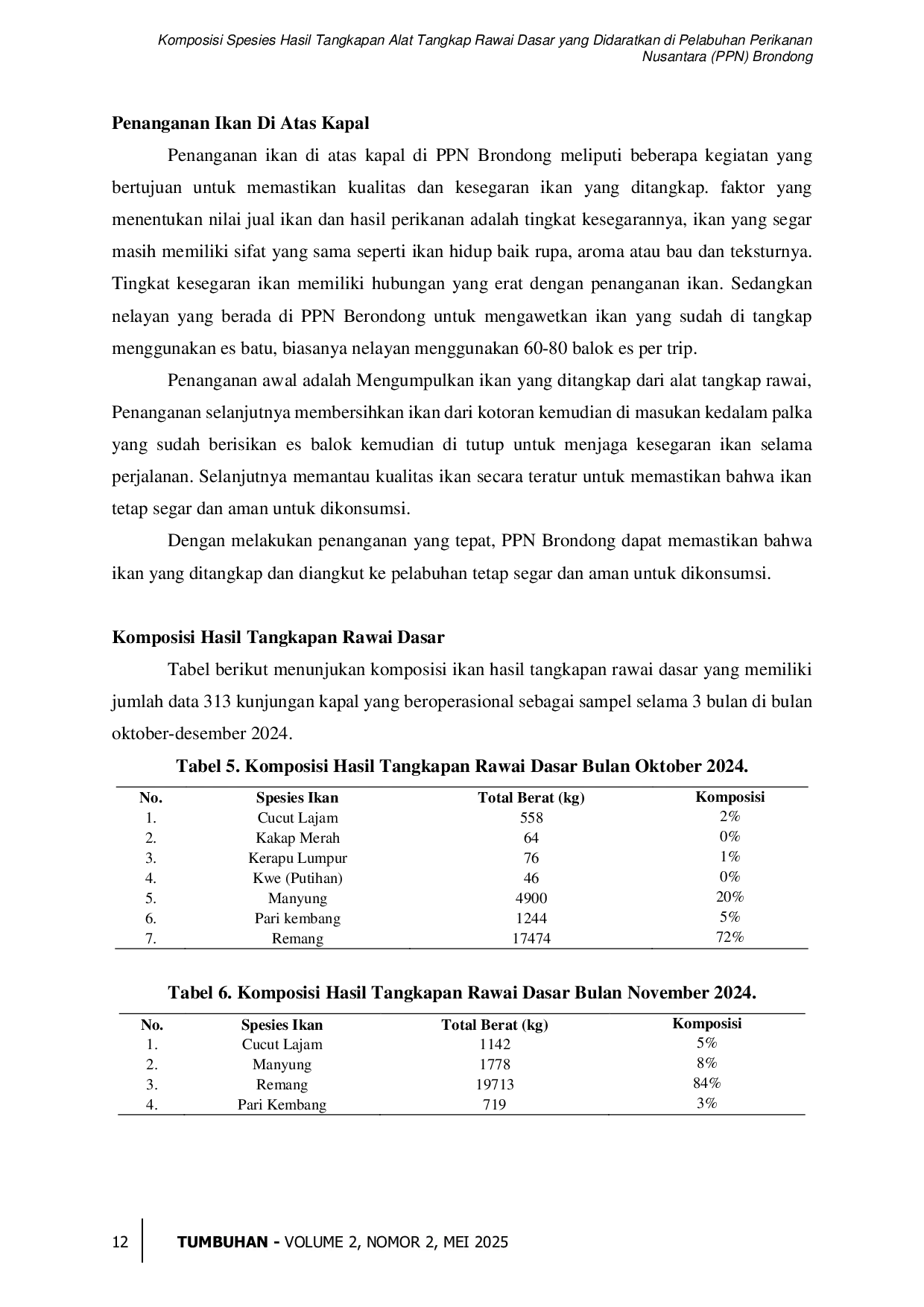 Tumbuhan : Publikasi Ilmu Sosiologi Pertanian Dan Ilmu KehutananTumbuhan : Publikasi Ilmu Sosiologi Pertanian Dan Ilmu KehutananPenelitian bertujuan untuk mengetahui spesies jenis ikan hasil tangkapan rawai dasar dan komposisi jumlah jenis spesies ikan. Waktu Pelaksanaan dilaksanakan pada bulan 11 Desember 2024 – 11 Januari 2025 di Pelabuhan Brondong Kabupaten Lamongan. Metode yang digunakan dalam penelitian ini adalah metode Eksperimental Fishing dengan melakukan pengamatan langsung terhadap tangkapan alat tangkap rawai dasar, kemudian melakukan pengamatan langsung terhadap jumlah ekor dan berat hasil tangkapan serta melakukan wawancara langsung dengan nelayan rawai dasar yang mengoperasikan alat tangkap rawai di perairan Brondong. Hasilnya tangkapan rawai dasar selama penelitian di PPN Brondong yang didaratkan pada bulan Desember 2024 terdapat empat jenis spesies yang tertangkap oleh alat tangkap rawai dasar yaitu Hiu cucut (Rhizoprionodon acutus), Ikan Manyung (Arius thalassinus), Pari Kembang (Taeniura lymma) dan Remang (Congresox talabonoides).