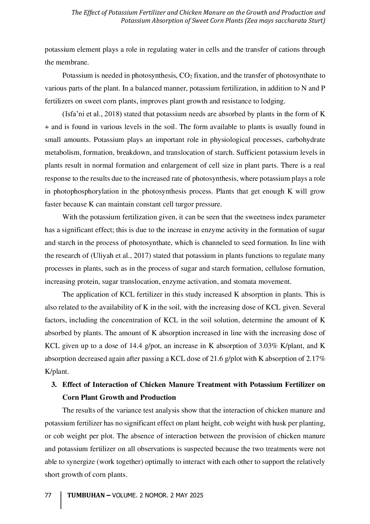 Penelitian ini menyimpulkan bahwa pemberian pupuk kalium secara signifikan mempengaruhi tinggi tanaman, berat tongkol dengan kulit per tanaman, dan berat tongkol per plot.Pemberian pupuk kandang ayam juga secara signifikan mempengaruhi tinggi tanaman, berat tongkol dengan kulit per tanaman, dan berat tongkol per plot.Interaksi antara pupuk kalium dan pupuk kandang ayam tidak berpengaruh signifikan terhadap semua parameter pengamatan.Untuk mengetahui dosis optimal pupuk kandang ayam terhadap pertumbuhan dan produksi tanaman jagung manis, penelitian lebih lanjut sangat dianjurkan, sementara dosis pupuk kalium yang optimal adalah 13.