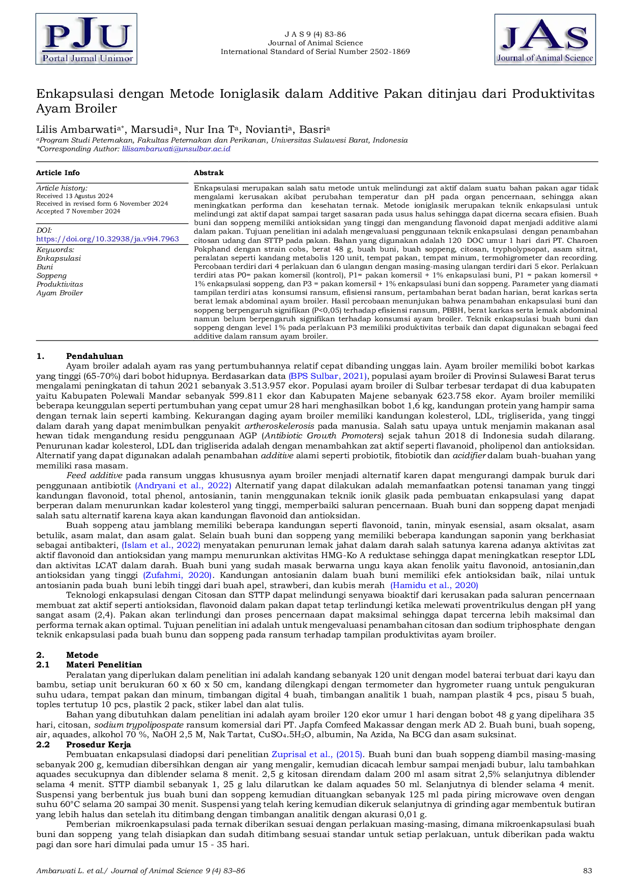 JASJASEnkapsulasi merupakan salah satu metode untuk melindungi zat aktif dalam suatu bahan pakan agar tidak mengalami kerusakan akibat perubahan temperatur dan pH pada organ pencernaan, sehingga akan meningkatkan performa dan kesehatan ternak. Metode ioniglasik merupakan teknik enkapsulasi untuk melindungi zat aktif dapat sampai target sasaran pada usus halus sehingga dapat dicerna secara efisien. Buah buni dan soppeng memiliki antioksidan yang tinggi dan mengandung flavonoid dapat menjadi additive alami dalam pakan. Tujuan penelitian ini adalah mengevaluasi penggunaan teknik enkapsulasi dengan penambahan citosan udang dan STTP pada pakan. Bahan yang digunakan adalah 120 DOC umur 1 hari dari PT. Charoen Pokphand dengan strain cobs, berat 48 g, buah buni, buah soppeng, citosan, trypholypsopat, asam sitrat, peralatan seperti kandang metabolis 120 unit, tempat pakan, tempat minum, termohigrometer dan recording.. Percobaan terdiri dari 4 perlakuan dan 6 ulangan dengan masing-masing ulangan terdiri dari 5 ekor. Perlakuan terdiri atas P0= pakan komersil (kontrol), P1= pakan komersil 1% enkapsulasi buni, P1 = pakan komersil 1% enkapsulasi soppeng, dan P3 = pakan komersil 1% enkapsulasi buni dan soppeng. Parameter yang diamati tampil terdiri atas konsumsi ransum, efisiensi ransum, pertambahan berat badan harian, berat karkas serta berat lemak abdominal ayam broiler. Hasil percobaan menunjukan bahwa penambahan enkapsulasi buni dan soppeng berpengaruh signifikan (P<0,05) terhadap efisiensi ransum, PBBH, berat karkas serta lemak abdominal namun belum berpengaruh signifikan terhadap konsumsi ayam broiler. Teknik enkapsulasi buah buni dan soppeng dengan level 1% pada perlakuan P3 memiliki produktivitas terbaik dan dapat digunakan sebagai feed additive dalam ransum ayam broiler.