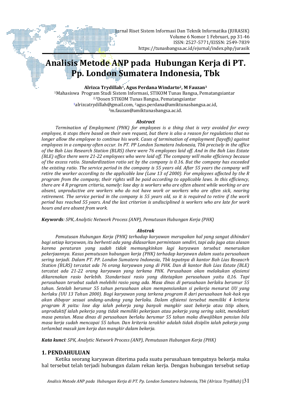 Jurasik (Jurnal Riset Sistem Informasi dan Teknik Informatika)Jurasik (Jurnal Riset Sistem Informasi dan Teknik Informatika)Pemutusan Hubungan Kerja (PHK) terhadap karyawan merupakan hal yang sangat dihindari bagi setiap karyawan, ada yang berhenti atas permintaan sendiri, namun ada juga yang terpaksa berhenti karena kebijakan perusahaan. Pada PT PP London Sumatera Indonesia Tbk di kantor Bah Lias Research Station tercatat ada 76 karyawan yang di PHK, dan di kantor Bah Lias Estate terdapat 21-22 tenaga kerja yang terkena PHK. Perusahaan melakukan efisiensi karena rasio tenaga kerja per hektar telah melampaui standar 0,16 yang ditetapkan. Empat kriteria program efisiensi adalah karyawan banyak absen, tidak produktif, mendekati usia pensiun 55 tahun, dan tidak disiplin. Penelitian ini menggunakan metode Analytic Network Process untuk membantu menentukan karyawan mana yang layak diberhentikan.