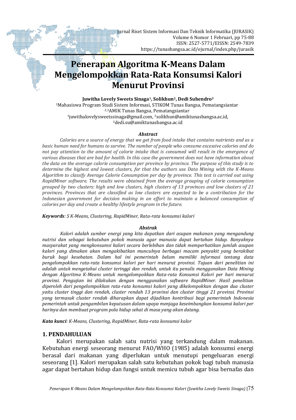 a) Teknik penerapan data mining menggunakan algoritma k-means dapat diterapkan dalam meng-cluster jumlah provinsi rata-rata konsumsi kalori mulai tahun 2007 sampai dengan 2018.b) Data yang sebelumnya diolah dalam perhitungan metode K-means clustering telah dilakukan pengujian menggunakan software Rapidminer versi 5.Sebagai pembuktian bahwa hasil dari software Rapidminer sama dengan hasil perhitungan manual pada metode K-means Clustering dan hasil yang diperoleh dalam meng-cluster data rata-rata konsumsi menurut provinsi yang digunakan adalah valid.Jumlah cluster 0 (Rendah) berjumlah 13 provinsi yaitu DKI Jakarta, Jawa Tengah, DI Yogyakarta, Jawa Timur, Nusa Tenggara Timur, Kalimantan Barat, Kalimantan Timur, Kalimantan Utara, Gorontalo, Maluku, Maluku Utara, Papua Barat, Papua.Jumlah cluster 1 (Tinggi) berjumlah 21 provinsi yaitu Aceh, Sumatera Utara, Sumatera Barat, Riau, Jambi, Sumatera Selatan, Bengkulu, Lampung, Kepulauan Bangka Belitung, Kepulauan Riau, Jawa Barat, Banten, Bali, Nusa Tenggara Barat, Kalimantan Tengah, Kalimantan Selatan, Sulawesi Utara, Sulawesi Tengah, Sulawesi Selatan, Sulawesi Tenggara, Sulawesi Barat.