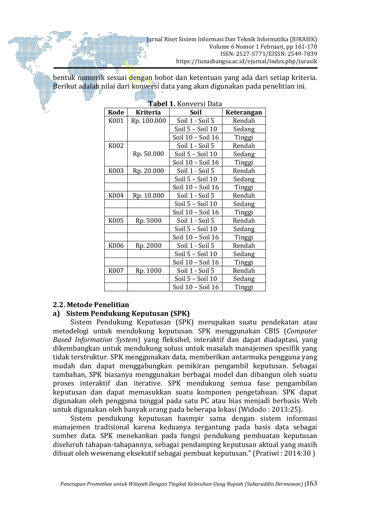 Jurasik (Jurnal Riset Sistem Informasi dan Teknik Informatika)Jurasik (Jurnal Riset Sistem Informasi dan Teknik Informatika)Metode Promethee termasuk ke dalam kelompok pemecahan masalah Multi Criteria Decision Making (MCDM) atau pengambilan keputusan kriteria majemuk yang merupakan disiplin ilmu yang sangat penting dalam pengambilan keputusan atau suatu masalah yang memiliki lebih dari satu kriteria (multikriteria). Tujuan utama dari pendekatan PROMETHEE ini adalah untuk mempermudah proses pengambilan keputusan dengan cara mengelompokkan tipe keputusan menjadi 6 fungsi kriteria yang cukup dapat mewakili semua jenis keputusan untuk menyelesaikan kasus-kasus sehari-hari dan melakukan kuantifikasi derajat preferensi dengan menggunakan maksimum 2 parameter yang memiliki karakteristik ekonomi yang signifikan. Untuk menghindari unsur subyektifitas dalam penentuan kelusuhan uang, maka penulis mencoba mengimplementasikan suatu sistem pendukung keputusan yang terdapat dalam PROMETHEE yang mampu membantu dalam penentuan tingkat kelusuhan uang. Sistem pendukung keputusan adalah sistem yang interaktif mendukung proses pengambilan keputusan. Metode PROMETHEE adalah salah satu metode yang menggunakan prinsip outranking untuk menyelesaikan permasalahan pengambilan keputusan untuk menetapkan alternatif terbaik dari sejumlah alternatif berdasarkan kriteria yang ditetapkan.