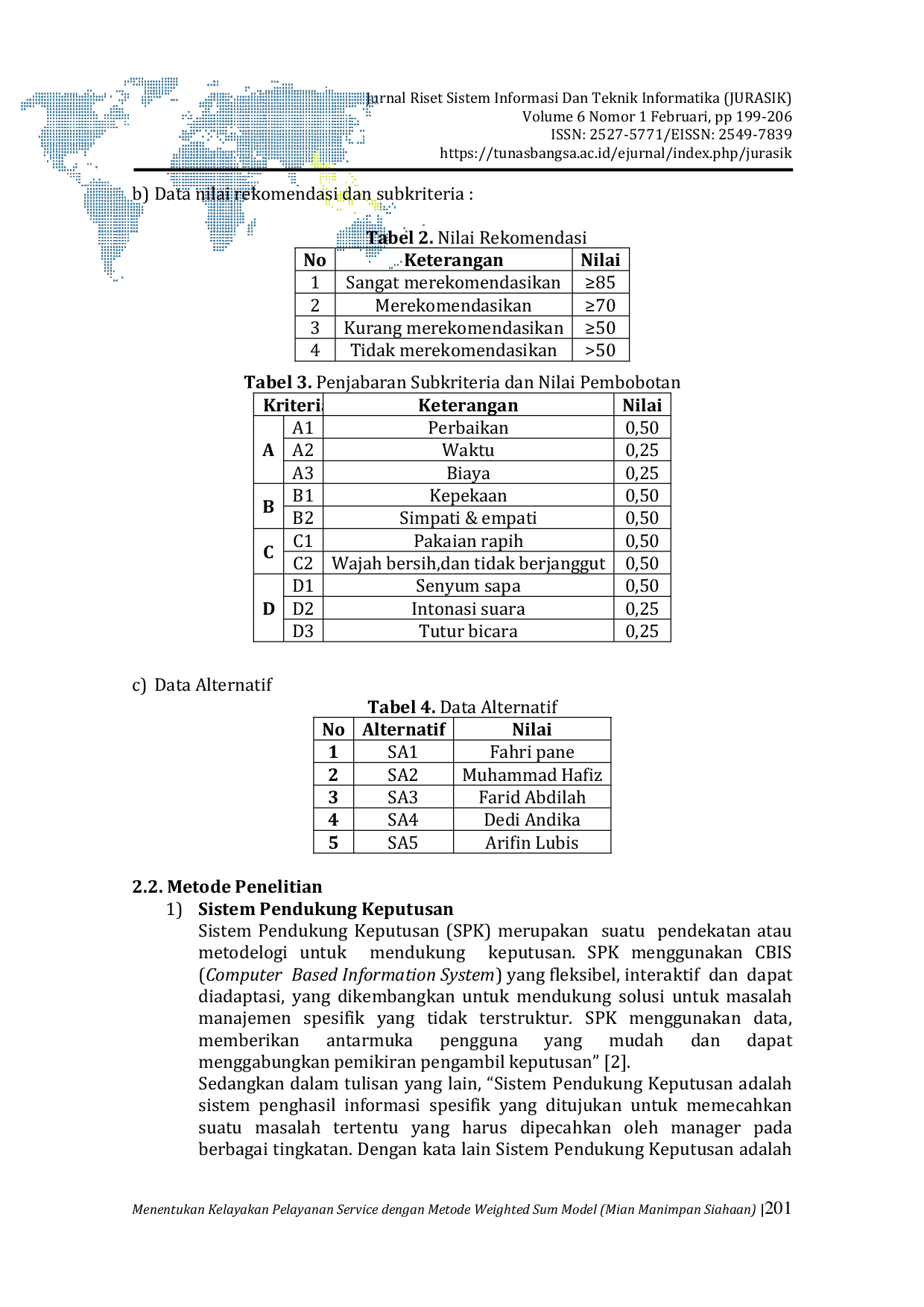 1. Bagaimana pengaruh integrasi variabel kepuasan pelanggan terhadap peringkat Service Advisor dalam model WSM? 2. Bisakah logika kabur dipadukan dengan WSM untuk menangani kriteria subyektif dan mendapatkan nilai yang lebih tepat? 3. Apakah model WSM dapat diterapkan secara efektif pada perusahaan layanan otomotif lain selain PT. Sutan Indo Aneka Mobil, dan apa perbedaan utama dalam pemilihan kriteria di situ?.