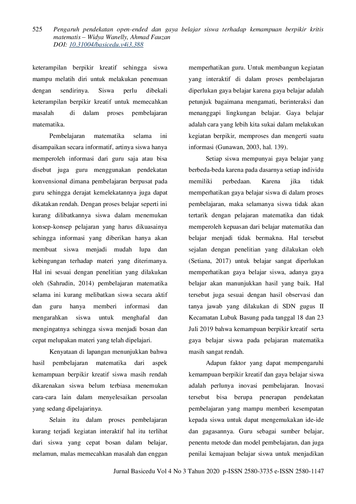 Jurnal BasiceduJurnal BasiceduKemampuan berpikir kreatif siswa kelas IV SD Gugus II Kecamatan Lubuk Basung masih rendah. Hal ini terjadi karena siswa belum terbiasa menyelesaikan permasalahan dengan cara mereka sendiri. Mereka terfokus terhadap penyelesaian yang diberikan oleh guru sehingga siswa sulit untuk mengembangkan ide-ide kreatif dalam menyelesaikan masalah dengan banyak cara. Salah satu upaya yang dapat dilakukan untuk mengatasi permasalahan tersebut adalah dengan pendekatan open ended. Jenis penelitian ini adalah quasi experiment. Populasi pada penelitian ini adalah siswa kelas IV SD gugus II Kecamatan Lubuk Basung Tahun Pelajaran 2019/2020. Sampel penelitian ini yaitu siswa kelas IV di SDN 38 Lubuk Sao sebagai kelas eksperimen dan siswa Kelas IV.a di SDN 63 Surabayo sebagai kelas kontrol. Berdasarkan hasil analisis data dan pembahasan diperoleh beberapa kesimpulan, yaitu: kemampuan berpikir kreatif siswa yang diajar dengan pendekatan open ended lebih baik daripada siswa yang diajar dengan pembelajaran konvensional. Kemampuan berpikir kreatif siswa yang bergaya belajar auditorial, visual dan kinestetik yang diajar dengan pendekatan open ended lebih baik dari siswa yang bergaya belajar auditorial, visual dan kinestetik yang diajar dengan pembelajaran konvensional. Tidak terdapat perbedaan kemampuan berpikir kreatif antara gaya belajar auditorial, visual dan kinestetik, dan tidak terdapat interaksi antara pendekatan pembelajaran dan gaya belajar dalam mempengaruhi kemampuan berpikir kreatif siswa.