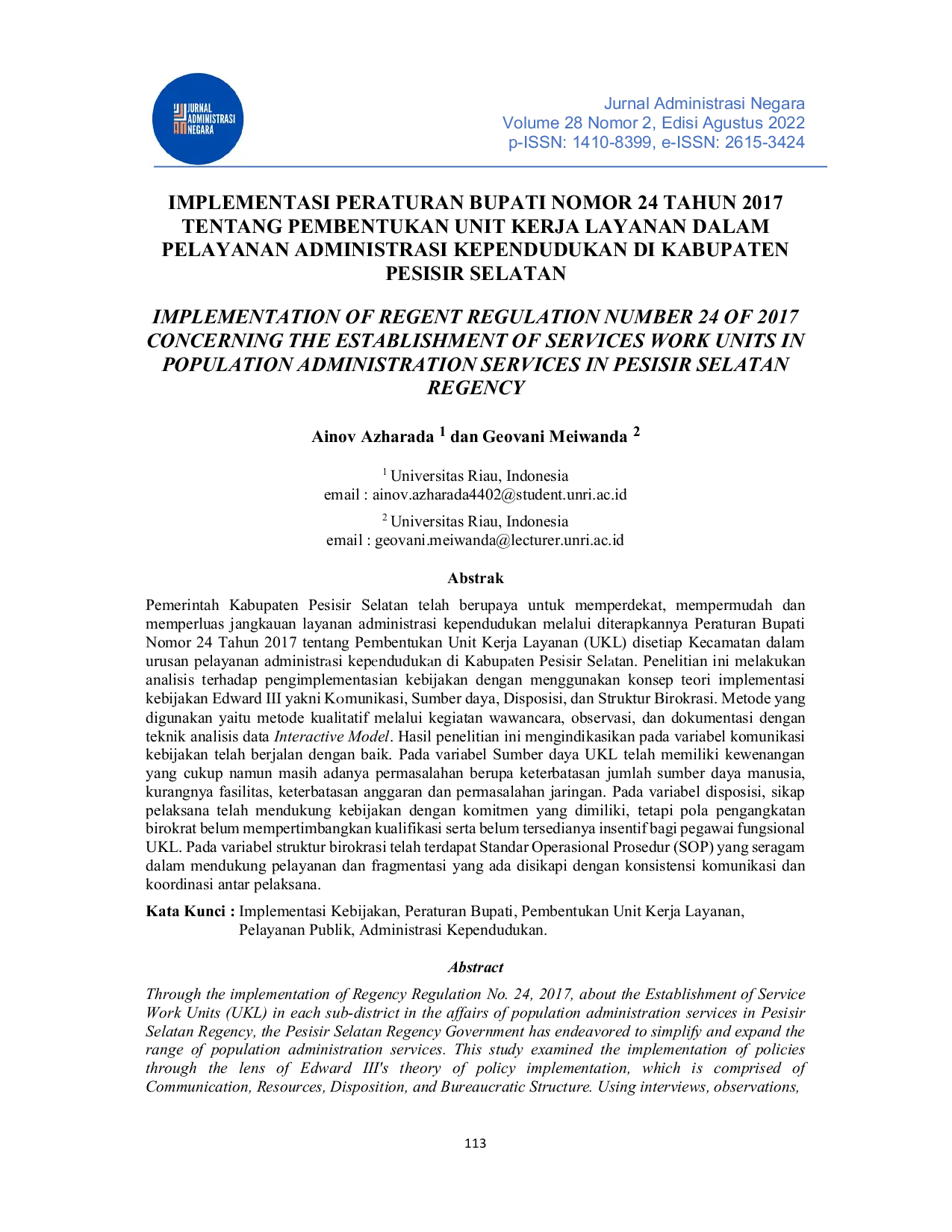 Jurnal Administrasi NegaraJurnal Administrasi NegaraPemerintah Kabupaten Pesisir Selatan telah berupaya untuk memperdekat, mempermudah dan memperluas jangkauan layanan administrasi kependudukan melalui diterapkannya Peraturan Bupati Nomor 24 Tahun 2017 tentang Pembentukan Unit Kerja Layanan (UKL) disetiap Kecamatan dalam urusan pelayanan administrasi kependudukan di Kabupaten Pesisir Selatan. Penelitian ini melakukan analisis terhadap pengimplementasian kebijakan dengan menggunakan konsep teori implementasi kebijakan Edward III yakni Komunikasi, Sumber daya, Disposisi, dan Struktur Birokrasi. Metode yang digunakan yaitu metode kualitatif melalui kegiatan wawancara, observasi, dan dokumentasi dengan teknik analisis data Interactive Model. Hasil penelitian ini mengindikasikan pada variabel komunikasi kebijakan telah berjalan dengan baik. Pada variabel Sumber daya UKL telah memiliki kewenangan yang cukup namun masih adanya permasalahan berupa keterbatasan jumlah sumber daya manusia, kurangnya fasilitas, keterbatasan anggaran dan permasalahan jaringan. Pada variabel disposisi, sikap pelaksana telah mendukung kebijakan dengan komitmen yang dimiliki, tetapi pola pengangkatan birokrat belum mempertimbangkan kualifikasi serta belum tersedianya insentif bagi pegawai fungsional UKL. Pada variabel struktur birokrasi telah terdapat Standar Operasional Prosedur (SOP) yang seragam dalam mendukung pelayanan dan fragmentasi yang ada disikapi dengan konsistensi komunikasi dan koordinasi antar pelaksana.