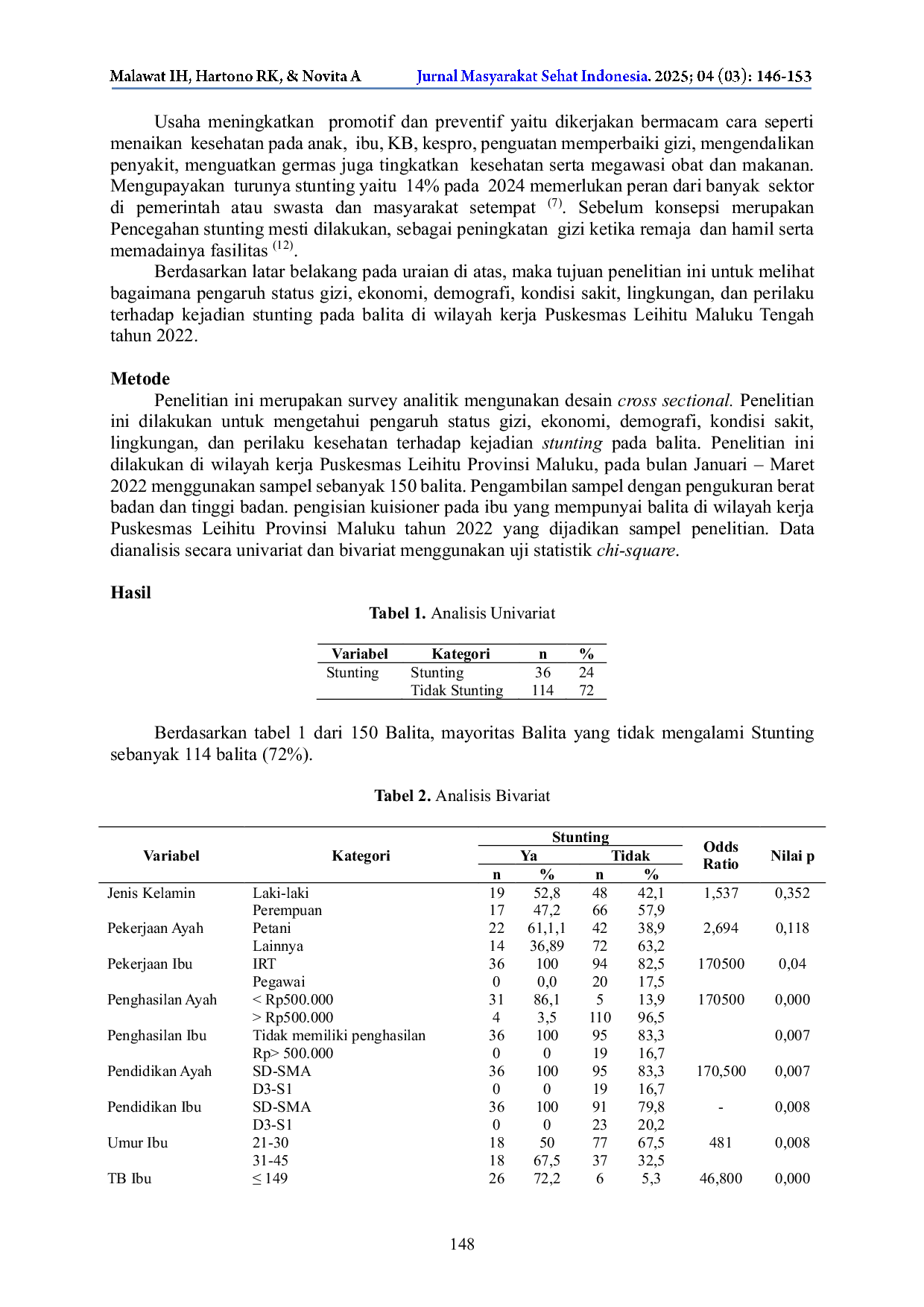 Jurnal Masyarakat Sehat IndonesiaJurnal Masyarakat Sehat IndonesiaAnak merupakan generasi penerus suatu bangsa. Anak stunting mengurangi kualitas SDM dan daya saing Nasional. Stunting merupakan beban global menimbulkan masalah besar untuk banyak Negara termasuk Indonesia. Stunting adalah keterlambatan perkembangan fisik tumbuh kembang anak disebabkan kekurangan gizi kronis mengakibatkan anak pendek Z-score <- 2SD. Dampak Stunting gangguan perkembangan otak, fisik, kognitif, menurunnya produktivitas, Daya tahan tubuh melemah, mudah terinfeksi penyakit, masalah pada Kesehatan reproduksi dan hasil reproduksi ketika dewasa. Tujuan penelitian mengetahui pengaruh status gizi, ekonomi, demografi, kondisi sakit di Wilayah kerja Puskesmas Leihitu Provinsi Maluku. Penelitian ini menggunakan rancangan cross sectional. Populasi Balita di wilayah kerja Puskesmas Leihitu dengan sampel sebanyak 150 Balita. Pengumpulan data kuisioner wawancara langsung ke rumah balita. Hasil uji statistik menunjukkan bahwa penghasilan ayah (nilai = 0,052), pola makan (nilai p = 0,001), dan paparan asap rokok (nilai p = 0,012) berhubungan dengan kejadian stunting pada balita. Maka dapat disimpulkan ada hubungan penghasilan Ayah, pola makan, dan paparan asap rokok terhadap kejadian stunting pada balita di wilayah kerja Puskesmas Leihitu Provinsi Maluku Tahun 2022.