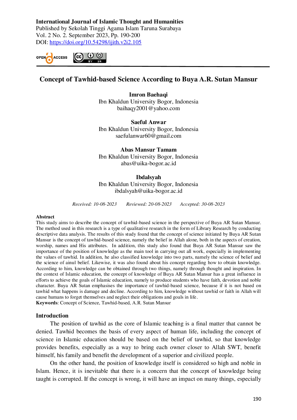 International Journal of Islamic Thought and HumanitiesInternational Journal of Islamic Thought and HumanitiesStudi ini bertujuan untuk menggambarkan konsep ilmu berbasis tawhid dalam perspektif Buya A.R. Sutan Mansur. Metode penelitian yang digunakan adalah jenis penelitian kualitatif berupa studi pustaka dengan analisis data deskriptif. Hasil penelitian menunjukkan bahwa konsep ilmu yang diinisiasi oleh Buya A.R. Sutan Mansur adalah konsep ilmu berbasis tawhid, yaitu keyakinan kepada Allah semata, baik dalam aspek penciptaan, ibadah, nama-nama dan sifat-sifat-Nya. Selain itu, penelitian ini juga menemukan bahwa Buya A.R. Sutan Mansur melihat pentingnya posisi pengetahuan sebagai alat utama dalam menjalankan semua pekerjaan, terutama dalam menerapkan nilai-nilai tawhid. Selain itu, ia juga mengklasifikasikan pengetahuan menjadi dua bagian, yaitu ilmu keyakinan dan ilmu ainul keyakinan. Demikian pula, ditemukan pula konsepnya mengenai cara memperoleh pengetahuan. Menurutnya, pengetahuan dapat diperoleh melalui dua hal, yaitu melalui pemikiran dan inspirasi. Dalam konteks pendidikan Islam, konsep pengetahuan Buya A.R. Sutan Mansur memiliki pengaruh besar dalam upaya mencapai tujuan pendidikan Islam, yaitu menghasilkan siswa yang memiliki iman, ketakwaan dan karakter mulia. Buya A.R. Sutan menekankan pentingnya ilmu berbasis tawhid, karena jika tidak berbasis tawhid yang terjadi adalah kerusakan dan kemunduran. Menurutnya, pengetahuan tanpa tawhid atau iman kepada Allah akan menyebabkan manusia lupa diri dan mengabaikan kewajiban serta tujuan-tujuan dalam hidup.