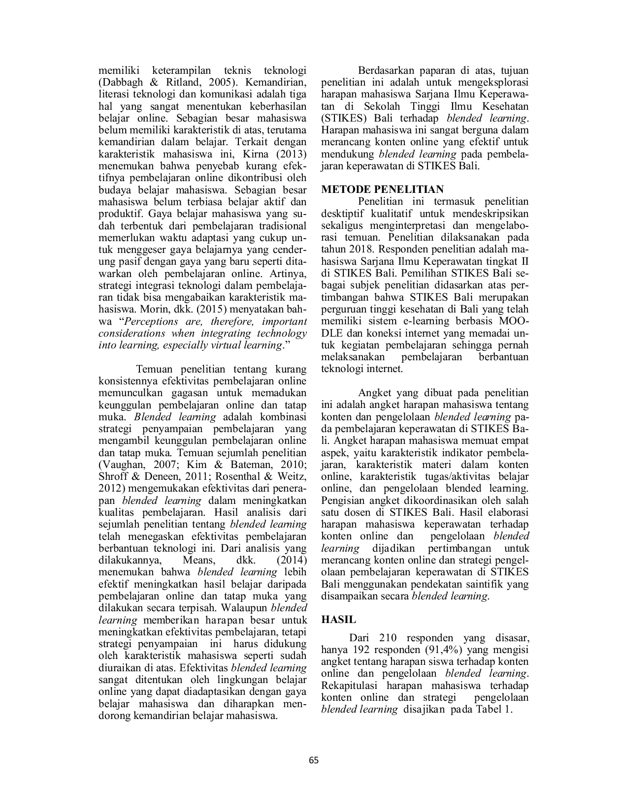 Jurnal Riset Kesehatan NasionalJurnal Riset Kesehatan NasionalEfektivitas suatu inovasi pembelajaran tidak bisa mengabaikan aspek penting karakteristik siswa. Pembelajaran online memiliki banyak keunggulan dilihat dari kekayaan sumber belajar dan aktivitas belajar. Efektivitas teknologi sangat tergantung pada bagaimana teknologi tersebut diintegrasikan atau dimanfaatkan dalam pembelajaran. Beberapa temuan penelitian melaporkan bahwa pemanfaatan ICT memberikan hasil yang tidak konsisten. Hasil yang tidak konsisten ini sebagian disebabkan oleh rendahnya kualitas sumber belajar berbasis ICT yang digunakan dan belum tepatnya strategi pengintegrasianya dalam pembelajaran. Sebagian besar kualitas konten online yang masih rendah dan belum dirancang sesuai dengan karakteristik subjek dan pedagogi. Pemanfaatan ICT masih mengalami banyak kendala, terutama ketersediaan sumber belajar digital yang berkualitas. Tujuan penelitian ini adalah untuk mendeskripsikan harapan mahasiswa terhadap konten online dan pengelolaan blended learning pada program studi Ilmu Keperawatan. Responden yang dipilih adalah mahasiswa Sarjana Ilmu Keperawatan di Sekolah Tinggi Ilmu Kesehatan (STIKES) Bali, Indonesia. Hasil penelitian menunjukkan bahwa dari 192 responden yang mengisi angket harapan mahasiswa terhadap konten online dan pengelolaan blended learning, mahasiswa keperawatan memberikan masukan yang berguna untuk mengembangkan konten online dan pengelolaan blended learning.