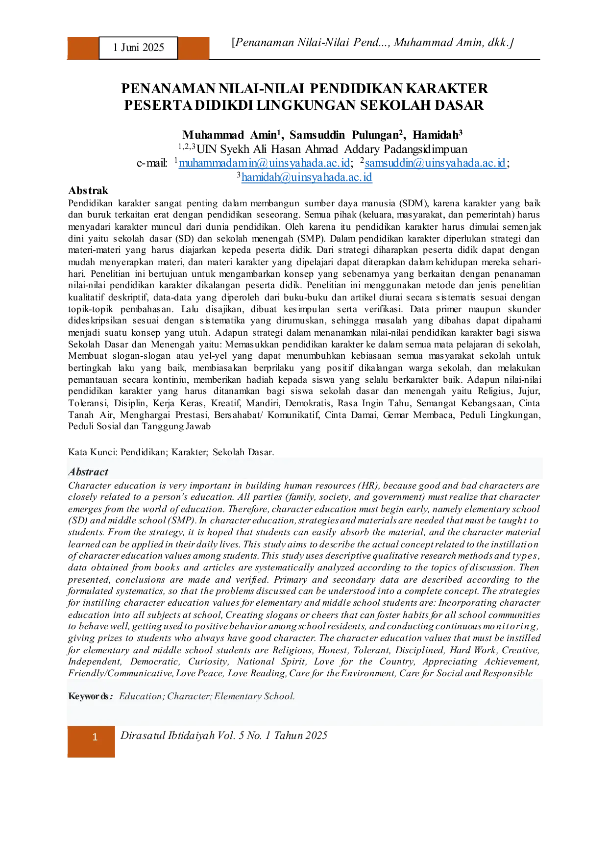 DIRASATUL IBTIDAIYAHDIRASATUL IBTIDAIYAHPendidikan karakter sangat penting dalam membangun sumber daya manusia (SDM), karena karakter yang baik dan buruk berkaitan erat dengan pendidikan seseorang. Semua pihak (keluarga, masyarakat, dan pemerintah) harus menyadari karakter muncul dari dunia pendidikan. Oleh karena itu pendidikan karakter harus dimulai semenjak dini yaitu sekolah dasar (SD) dan sekolah menengah (SMP). Dalam pendidikan karakter diperlukan strategi dan materi-materi yang harus diajarkan kepada peserta didik. Dari strategi diharapkan peserta didik dapat dengan mudah menyerapkan materi, dan materi karakter yang dipelajari dapat diterapkan dalam kehidupan mereka sehari-hari. Penelitian ini bertujuan untuk mengambarkan konsep yang sebenarnya yang berkaitan dengan penanaman nilai-nilai pendidikan karakter dikalangan peserta didik. Penelitian ini menggunakan metode dan jenis penelitian kualitatif deskriptif, data-data yang diperoleh dari buku-buku dan artikel diurai secara sistematis sesuai dengan topik-topik pembahasan. Lalu disajikan, dibuat kesimpulan serta verifikasi. Data primer maupun skunder dideskripsikan sesuai dengan sistematika yang dirumuskan, sehingga masalah yang dibahas dapat dipahami menjadi suatu konsep yang utuh. Adapun strategi dalam menanamkan nilai-nilai pendidikan karakter bagi siswa Sekolah Dasar dan Menengah yaitu: Memasukkan pendidikan karakter ke dalam semua mata pelajaran di sekolah, Membuat slogan-slogan atau yel-yel yang dapat menumbuhkan kebiasaan semua masyarakat sekolah untuk bertingkah laku yang baik, membiasakan berperilaku yang positif dikalangan warga sekolah, dan melakukan pemantauan secara kontiniu, memberikan hadiah kepada siswa yang selalu berkarakter baik. Adapun nilai-nilai pendidikan karakter yang harus ditanamkan bagi siswa sekolah dasar dan menengah yaitu Religius, Jujur, Toleransi, Disiplin, Kerja Keras, Kreatif, Mandiri, Demokratis, Rasa Ingin Tahu, Semangat Kebangsaan, Cinta Tanah Air, Menghargai Prestasi, Bersahabat/ Komunikatif, Cinta Damai, Gemar Membaca, Peduli Lingkungan, Peduli Sosial dan Tanggung Jawab.