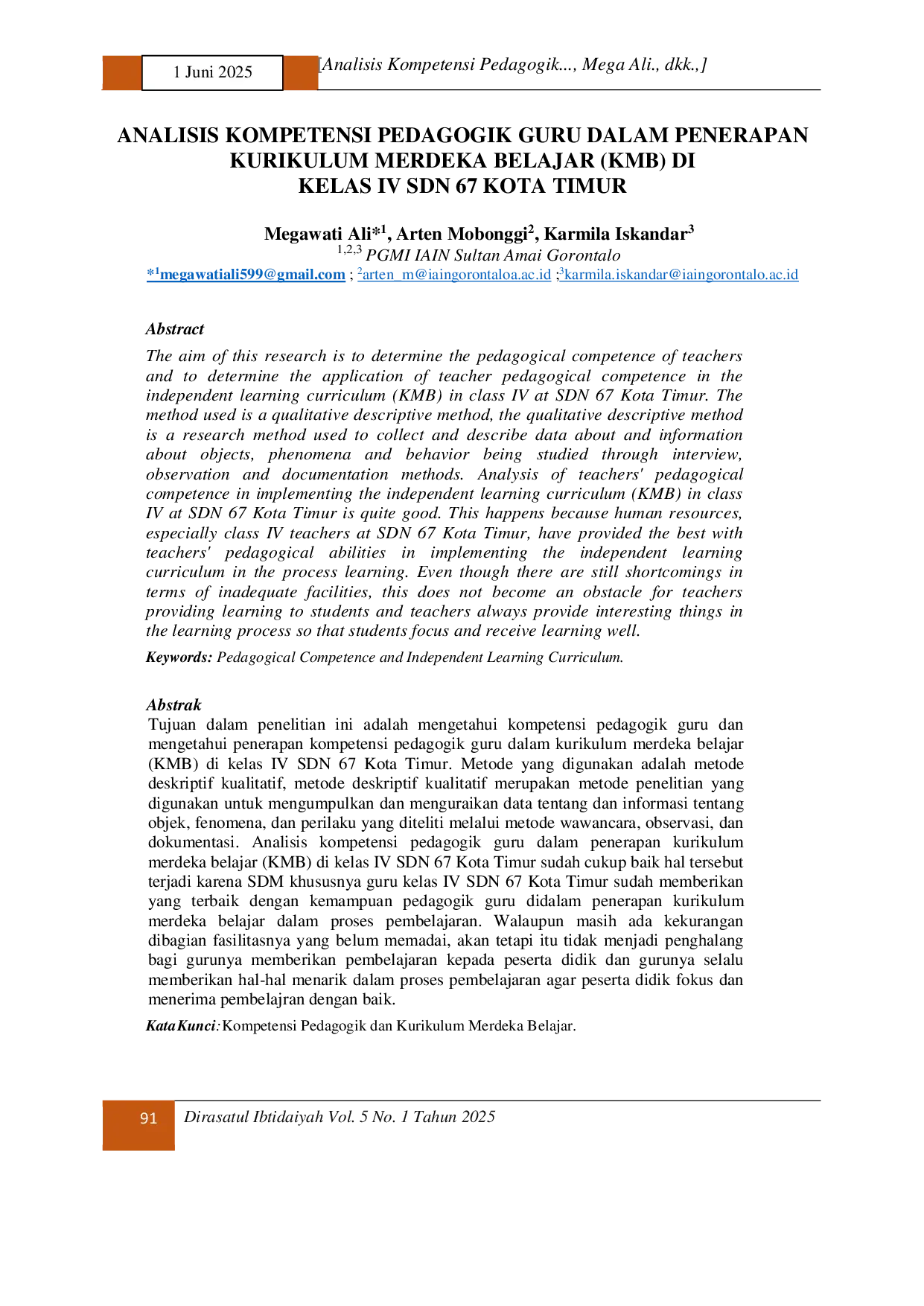 DIRASATUL IBTIDAIYAHDIRASATUL IBTIDAIYAHTujuan dalam penelitian ini adalah mengetahui kompetensi pedagogik guru dan mengetahui penerapan kompetensi pedagogik guru dalam kurikulum merdeka belajar (KMB) di kelas IV SDN 67 Kota Timur. Metode yang digunakan adalah metode deskriptif kualitatif, metode deskriptif kualitatif merupakan metode penelitian yang digunakan untuk mengumpulkan dan menguraikan data tentang dan informasi tentang objek, fenomena, dan perilaku yang diteliti melalui metode wawancara, observasi, dan dokumentasi. Analisis kompetensi pedagogik guru dalam penerapan kurikulum merdeka belajar (KMB) di kelas IV SDN 67 Kota Timur sudah cukup baik hal tersebut terjadi karena SDM khususnya guru kelas IV SDN 67 Kota Timur sudah memberikan yang terbaik dengan kemampuan pedagogik guru didalam penerapan kurikulum merdeka belajar dalam proses pembelajaran. Walaupun masih ada kekurangan dibagian fasilitasnya yang belum memadai, akan tetapi itu tidak menjadi penghalang bagi gurunya memberikan pembelajaran kepada peserta didik dan gurunya selalu memberikan hal-hal menarik dalam proses pembelajaran agar peserta didik fokus dan menerima pembelajaran dengan baik.