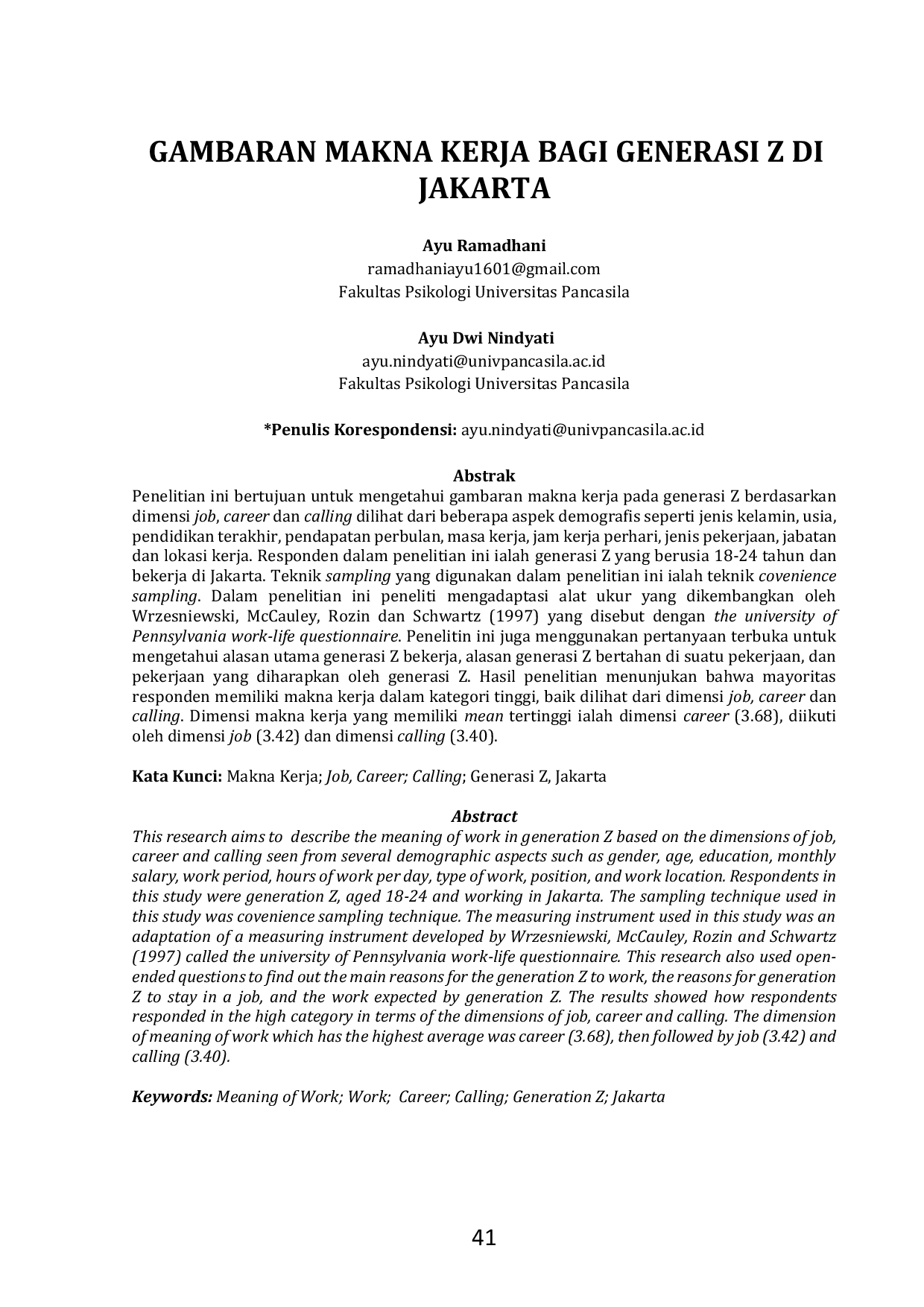 INQUIRY: Jurnal Ilmiah PsikologiINQUIRY: Jurnal Ilmiah PsikologiPenelitian ini bertujuan untuk mengetahui gambaran makna kerja pada generasi Z berdasarkan dimensi job, career dan calling dilihat dari beberapa aspek demografis seperti jenis kelamin, usia, pendidikan terakhir, pendapatan perbulan, masa kerja, jam kerja perhari, jenis pekerjaan, jabatan dan lokasi kerja. Responden dalam penelitian ini adalah generasi Z yang berusia 18-24 tahun dan bekerja di Jakarta. Hasil penelitian menunjukan bahwa mayoritas responden memiliki makna kerja dalam kategori tinggi, baik dilihat dari dimensi job, career dan calling. Dimensi makna kerja yang memiliki mean tertinggi ialah dimensi career (3.68), diikuti oleh dimensi job (3.42) dan dimensi calling (3.40).
