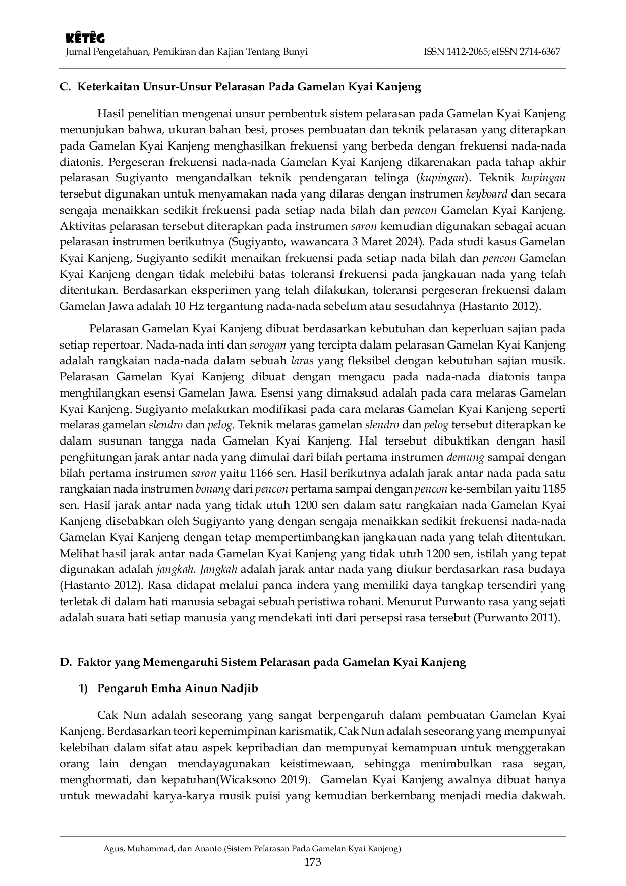 Keteg : Jurnal Pengetahuan, Pemikiran dan Kajian Tentang BunyiKeteg : Jurnal Pengetahuan, Pemikiran dan Kajian Tentang BunyiArtikel ini bertujuan untuk mengetahui dan faktor-faktor yang memengaruhi sistem pelarasan tersebut. Penelitian ini menggabungkan metode kualitatif dan kuantitatif, dengan teknik studi pustaka, observasi, wawancara, dan studi dokumentasi. Hasil penelitian menunjukkan bahwa sistem pelarasan Gamelan Kyai Kanjeng adalah sistem yang fleksibel dan dapat mencakup beberapa genre musik dengan tonalitas diatonis. Sistem pelarasan ini dipengaruhi oleh faktor-faktor seperti pengaruh Emha Ainun Nadjib, pengalaman empiris pembuat gamelan, dan repertoar dari kelompok musik Kyai Kanjeng.