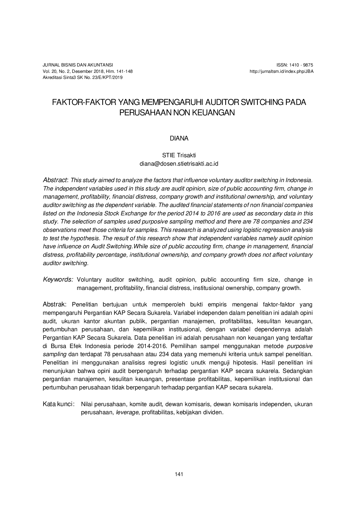 Jurnal Bisnis dan AkuntansiJurnal Bisnis dan AkuntansiPenelitian bertujuan untuk memperoleh bukti empiris mengenai faktor-faktor yang mempengaruhi Pergantian KAP Secara Sukarela. Variabel independen dalam penelitian ini adalah opini audit, ukuran kantor akuntan publik, pergantian manajemen, profitabilitas, kesulitan keuangan, pertumbuhan perusahaan, dan kepemilikan institusional, dengan variabel dependennya adalah Pergantian KAP Secara Sukarela. Data penelitian ini adalah perusahaan non keuangan yang terdaftar di Bursa Efek Indonesia periode 2014-2016. Pemilihan sampel menggunakan metode purposive sampling dan terdapat 78 perusahaan atau 234 data yang memenuhi kriteria untuk sampel penelitian. Penelitian ini menggunakan analisis regresi logistic untuk menguji hipotesis. Hasil penelitian ini menunjukan bahwa opini audit berpengaruh terhadap pergantian KAP secara sukarela. Sedangkan pergantian manajemen, kesulitan keuangan, presentase profitabilitas, kepemilikan institusional dan pertumbuhan perusahaan tidak berpengaruh terhadap pergantian KAP secara sukarela.