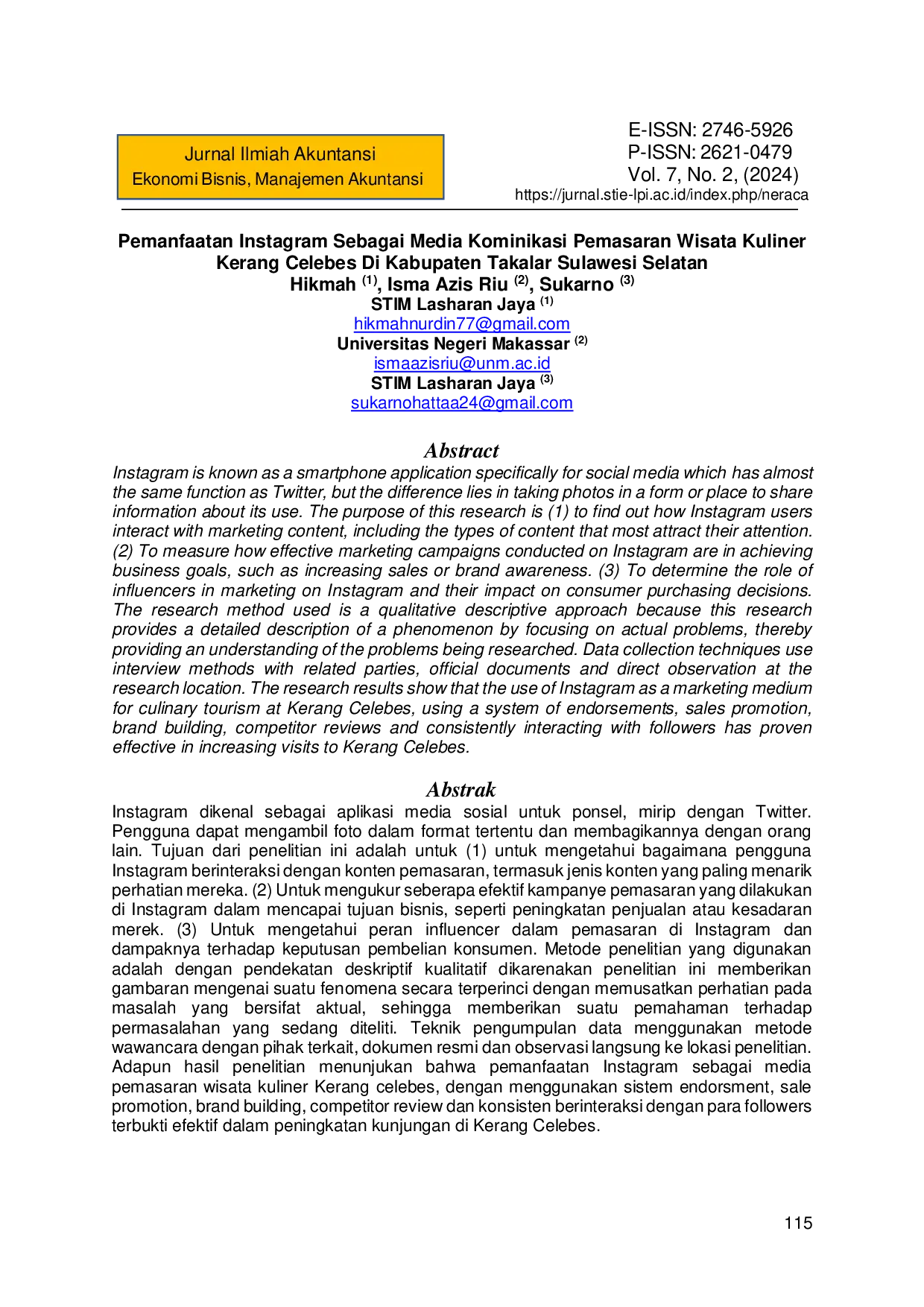 Jurnal Ilmiah Neraca : Ekonomi Bisnis, Manajemen, AkuntansiJurnal Ilmiah Neraca : Ekonomi Bisnis, Manajemen, AkuntansiInstagram dikenal sebagai aplikasi media sosial untuk ponsel, mirip dengan Twitter. Pengguna dapat mengambil foto dalam format tertentu dan membagikannya dengan orang lain. Tujuan dari penelitian ini adalah untuk (1) untuk mengetahui bagaimana pengguna Instagram berinteraksi dengan konten pemasaran, termasuk jenis konten yang paling menarik perhatian mereka. (2) Untuk mengukur seberapa efektif kampanye pemasaran yang dilakukan di Instagram dalam mencapai tujuan bisnis, seperti peningkatan penjualan atau kesadaran merek. (3) Untuk mengetahui peran influencer dalam pemasaran di Instagram dan dampaknya terhadap keputusan pembelian konsumen. Metode penelitian yang digunakan adalah dengan pendekatan deskriptif kualitatif dikarenakan penelitian ini memberikan gambaran mengenai suatu fenomena secara terperinci dengan memusatkan perhatian pada masalah yang bersifat aktual, sehingga memberikan suatu pemahaman terhadap permasalahan yang sedang diteliti. Teknik pengumpulan data menggunakan metode wawancara dengan pihak terkait, dokumen resmi dan observasi langsung ke lokasi penelitian. Adapun hasil penelitian menunjukan bahwa pemanfaatan Instagram sebagai media pemasaran wisata kuliner Kerang celebes, dengan menggunakan sistem endorsment, sale promotion, brand building, competitor review dan konsisten berinteraksi dengan para followers terbukti efektif dalam peningkatan kunjungan di Kerang Celebes.