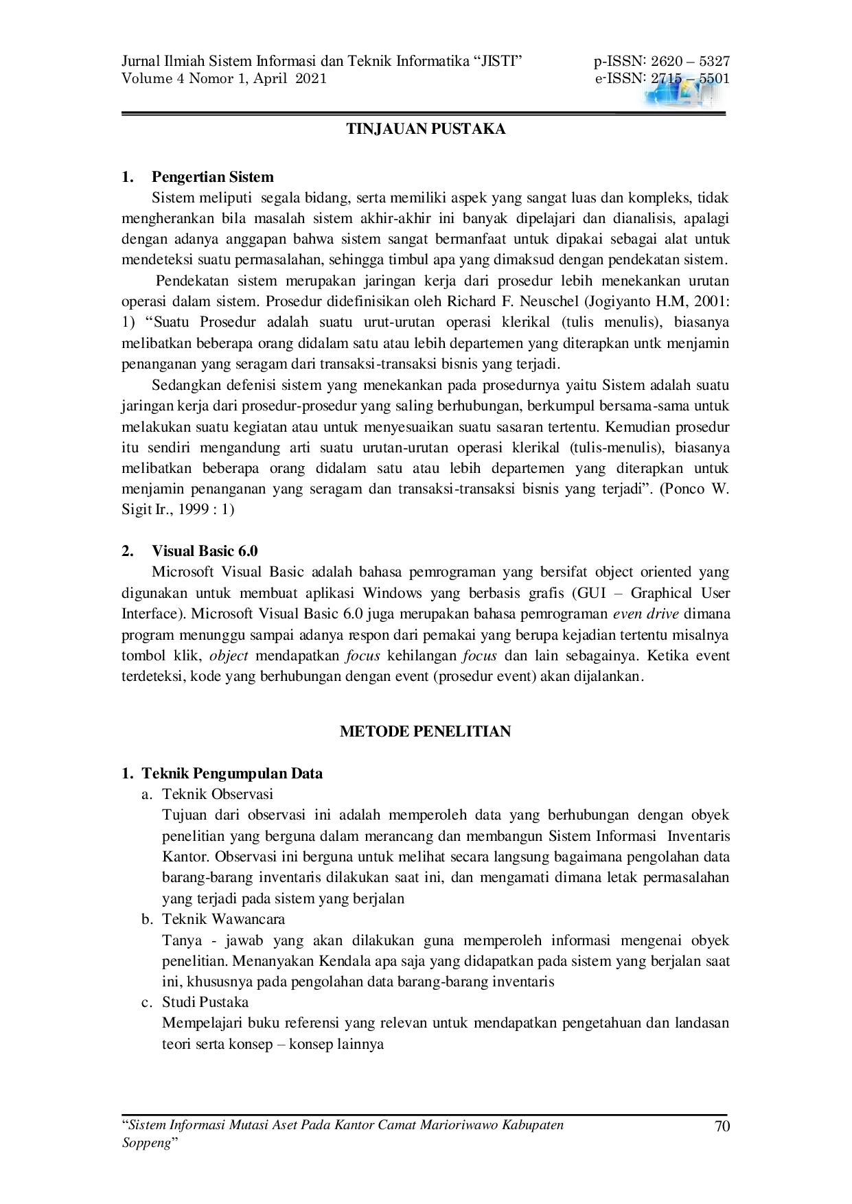 Jurnal Ilmiah Sistem Informasi dan Teknik Informatika (JISTI)Jurnal Ilmiah Sistem Informasi dan Teknik Informatika (JISTI)Selama ini pengolahan data barang inventaris Kantor Camat Marioriwawo Kabupaten Soppeng belum menggunakan suatu aplikasi komputer yang khusus untuk mengolah data barang inventaris. Pencatatan barang inventaris yang terjadi dilakukan secara manual. sistem informasi barang inventaris dalam hal ini pendataan barang inventaris secara elektronik sebagai solusi. Dimana sistem informasi tersebut memiliki fungsi dan kemampuan yang dapat memberikan informasi yang akurat ketika dibutuhkan. Dengan menggunakan konsep database pendataan barang inventaris tidak perlu dilakukan berulang-ulang. Dan juga dengan menggunakan konsep database, perulangan data yang tidak diperlukan dapat dihilangkan. Dengan diimplementasikannya sistem informasi aset berbasis komputer dengan menggunakan bahasa pemrograman Visual basic 6.0, pengolahan data yang cepat dan akurat dapat tercapai.