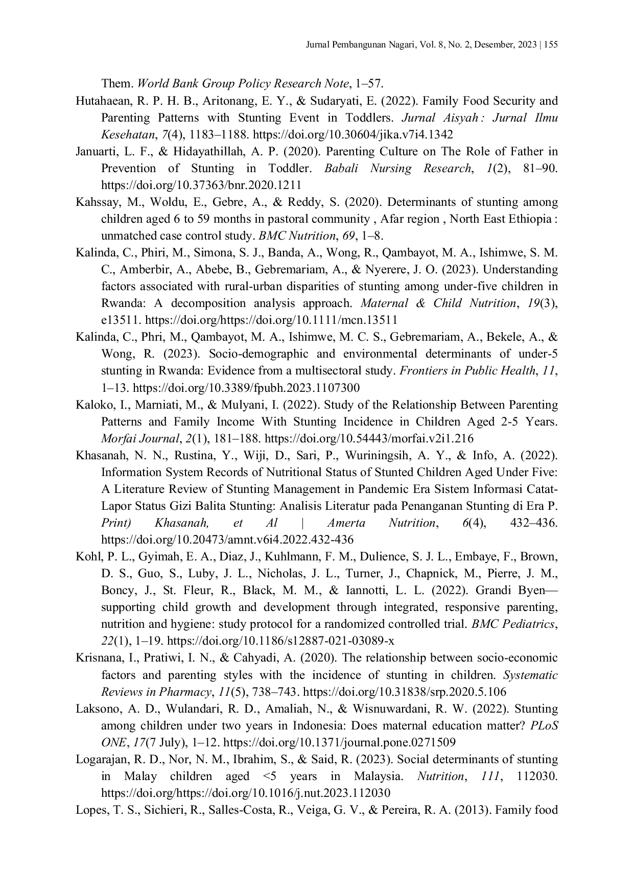 Jurnal Pembangunan NagariJurnal Pembangunan NagariPola asuh merupakan suatu bentuk interaksi antara orang tua kepada anak dalam mendidik, membimbing dan memberikan perlindungan agar anak mampu berinteraksi di masyarakat dan bisa bersikap mandiri. Pola asuh yang baik terutama akan menstimulus pertumbuhan dan perkembangan anak (stunting). Tujuan penelitian ini adalah untuk mereview hubungan pola asuh dan ekonomi dengan kejadian stunting.