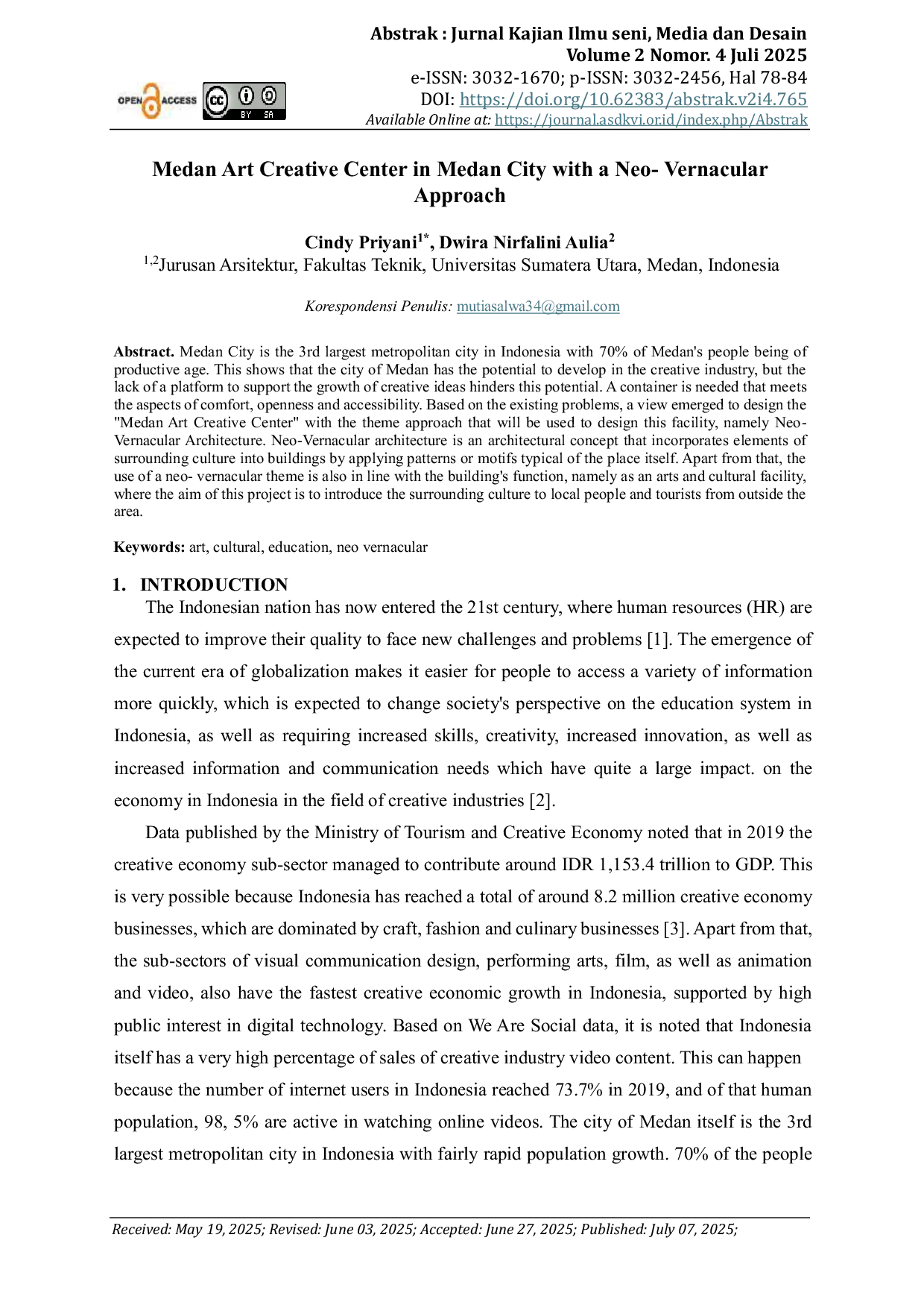 Abstrak : Jurnal Kajian Ilmu seni, Media dan DesainAbstrak : Jurnal Kajian Ilmu seni, Media dan DesainKota Medan adalah kota metropolitan terbesar ketiga di Indonesia dengan 70% penduduk Medan berada pada usia produktif. Hal ini menunjukkan bahwa kota Medan memiliki potensi untuk berkembang dalam industri kreatif, tetapi kurangnya platform untuk mendukung pertumbuhan ide-ide kreatif menghambat potensi ini. Sebuah wadah diperlukan yang memenuhi aspek kenyamanan, keterbukaan dan aksesibilitas. Berdasarkan masalah yang ada, muncul pandangan untuk merancang Medan Art Creative Center dengan tema pendekatan yang akan digunakan untuk merancang fasilitas ini, yaitu Arsitektur Neo-Vernakular. Arsitektur Neo-Vernakular adalah konsep arsitektur yang menggabungkan elemen budaya di sekitarnya ke dalam bangunan dengan menerapkan pola atau motif khas tempat tersebut. Selain itu, penggunaan tema neo- vernakular juga sejalan dengan fungsi bangunan, yaitu sebagai fasilitas seni dan budaya, di mana tujuan dari proyek ini adalah memperkenalkan budaya di sekitarnya kepada masyarakat lokal dan wisatawan dari luar daerah.