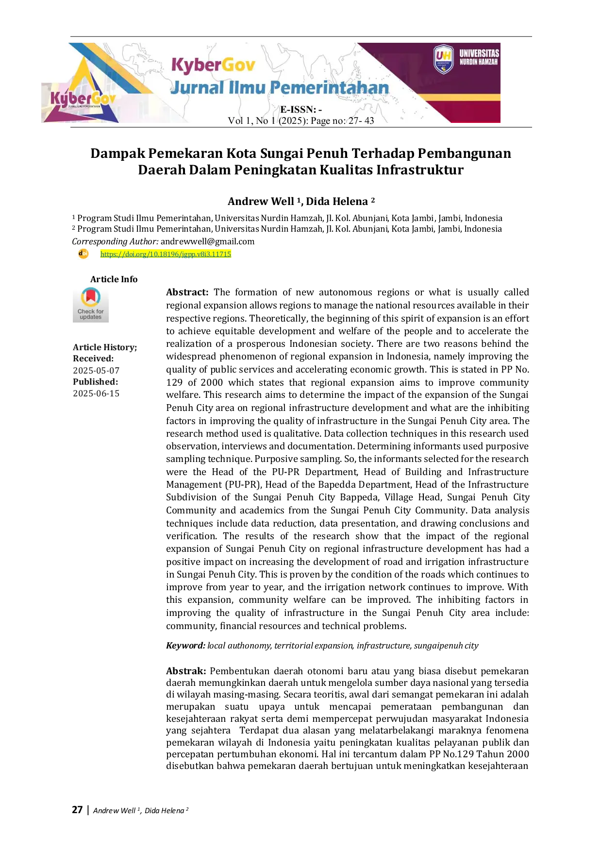 KyberGov: Jurnal Ilmu PemerintahanKyberGov: Jurnal Ilmu PemerintahanPembentukan daerah otonomi baru atau yang biasa disebut pemekaran daerah memungkinkan daerah untuk mengelola sumber daya nasional yang tersedia di wilayah masing-masing. Secara teoritis, awal dari semangat pemekaran ini merupakan suatu upaya untuk mencapai pemerataan pembangunan dan kesejahteraan rakyat serta demi mempercepat perwujudan masyarakat Indonesia yang sejahtera. Terdapat dua alasan yang melatarbelakangi maraknya fenomena pemekaran wilayah di Indonesia yaitu peningkatan kualitas pelayanan publik dan percepatan pertumbuhan ekonomi. Hal ini tercantum dalam PP No.129 Tahun 2000 disebutkan bahwa pemekaran daerah bertujuan untuk meningkatkan kesejahteraan masyarakat. Penelitian ini bertujuan untuk mengetahui dampak pemekaran daerah Kota Sungai Penuh terhadap pembangunan infrastruktur daerah serta apa saja faktor penghambat dalam peningkatan kualitas infrastruktur di wilayah Kota Sungai Penuh. Metode penelitian yang digunakan adalah kualitatif. Teknik pengumpulan data pada penelitian ini menggunakan observasi, wawancara dan dokumentasi. Penentuan informan menggunakan teknik purposive sampling. Teknik analisis data di antaranya dengan cara reduksi data, penyajian data, dan menarik kesimpulan dan verifikasi. Hasil penelitian menunjukkan bahwa dampak pemekaran daerah Kota Sungai Penuh terhadap pembangunan infrastruktur daerah memberikan dampak positif terhadap peningkatan pembangunan infrastruktur jalan dan irigasi Kota Sungai Penuh. Hal ini dibuktikan dengan kondisi jalan yang terus membaik dari tahun ke tahun, selanjutnya jaringan irigasi yang terus meningkatkan. Dengan adanya pemekaran tersebut dapat peningkatan kesejahteraan masyarakat. Adapun faktor penghambat dalam peningkatan kualitas infrastruktur di wilayah Kota Sungai Penuh, di antaranya yaitu: masyarakat, sumber daya finansial dan masalah teknis.