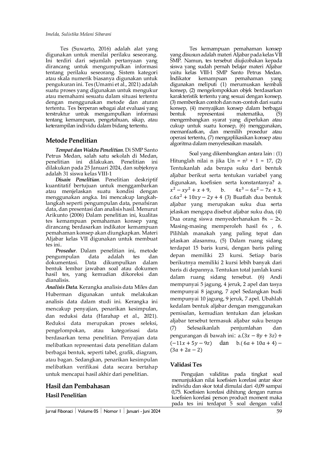 Penelitian ini menyimpulkan bahwa dari tujuh item tes kemampuan pemahaman konsep, enam item dinyatakan valid sementara satu item tidak valid.Tingkat reliabilitas tes secara keseluruhan berada pada kategori sedang dengan koefisien 0,60.Instrumen tes yang telah dikembangkan ini direkomendasikan untuk dijadikan acuan dalam penyusunan tes materi aljabar atau topik matematika lainnya di masa mendatang, dengan catatan evaluasi lebih lanjut terhadap item yang tidak valid, khususnya soal nomor 5.