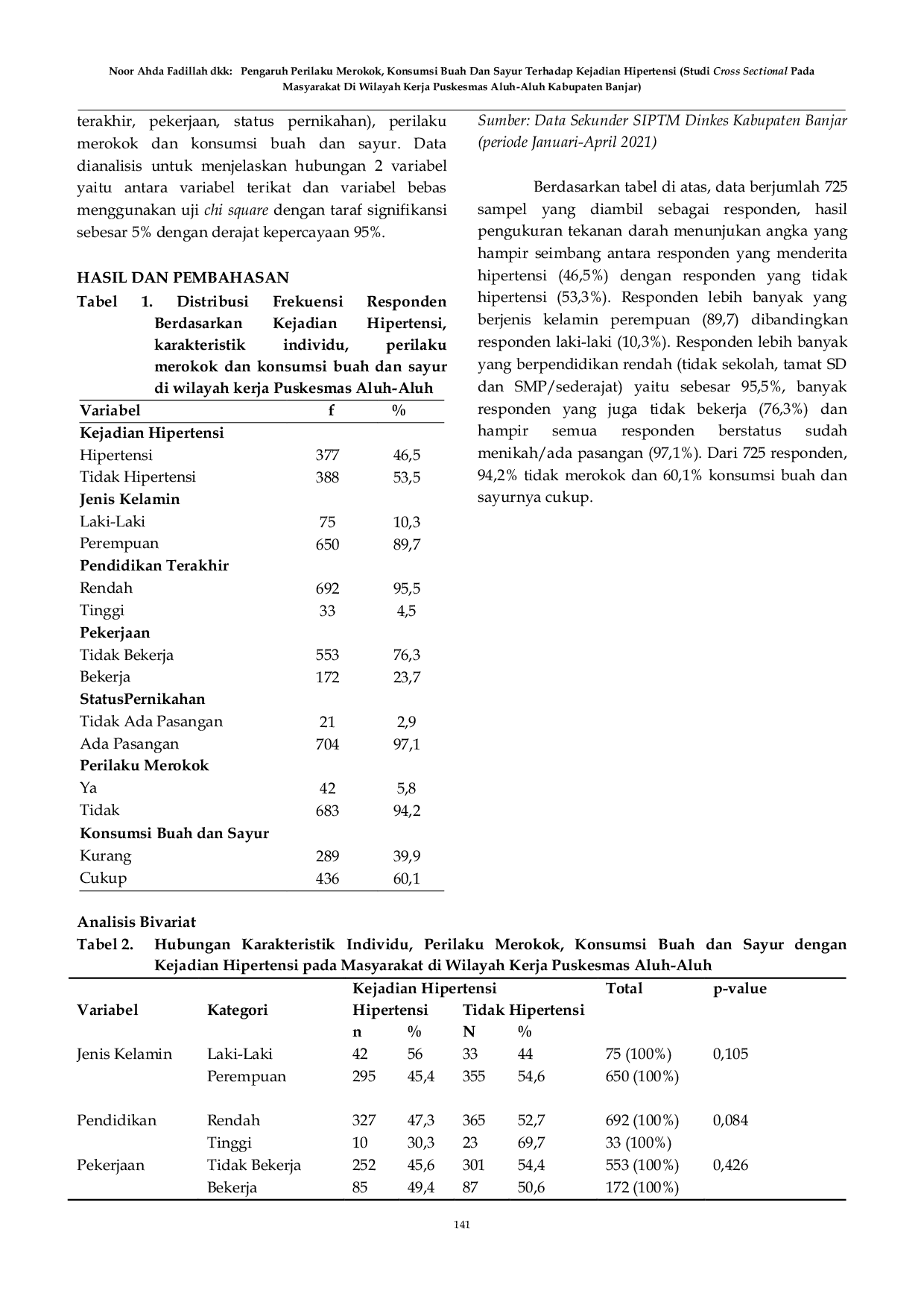 Perilaku merokok berhubungan dengan kejadian hipertensi pada masyarakat di wilayah kerja Puskesmas Aluh-Aluh.Faktor-faktor lain seperti jenis kelamin, pendidikan terakhir, pekerjaan, status pernikahan dan konsumsi buah dan sayur tidak menunjukkan hubungan dengan kejadian hipertensi pada masyarakat di wilayah kerja Puskesmas Aluh-Aluh.