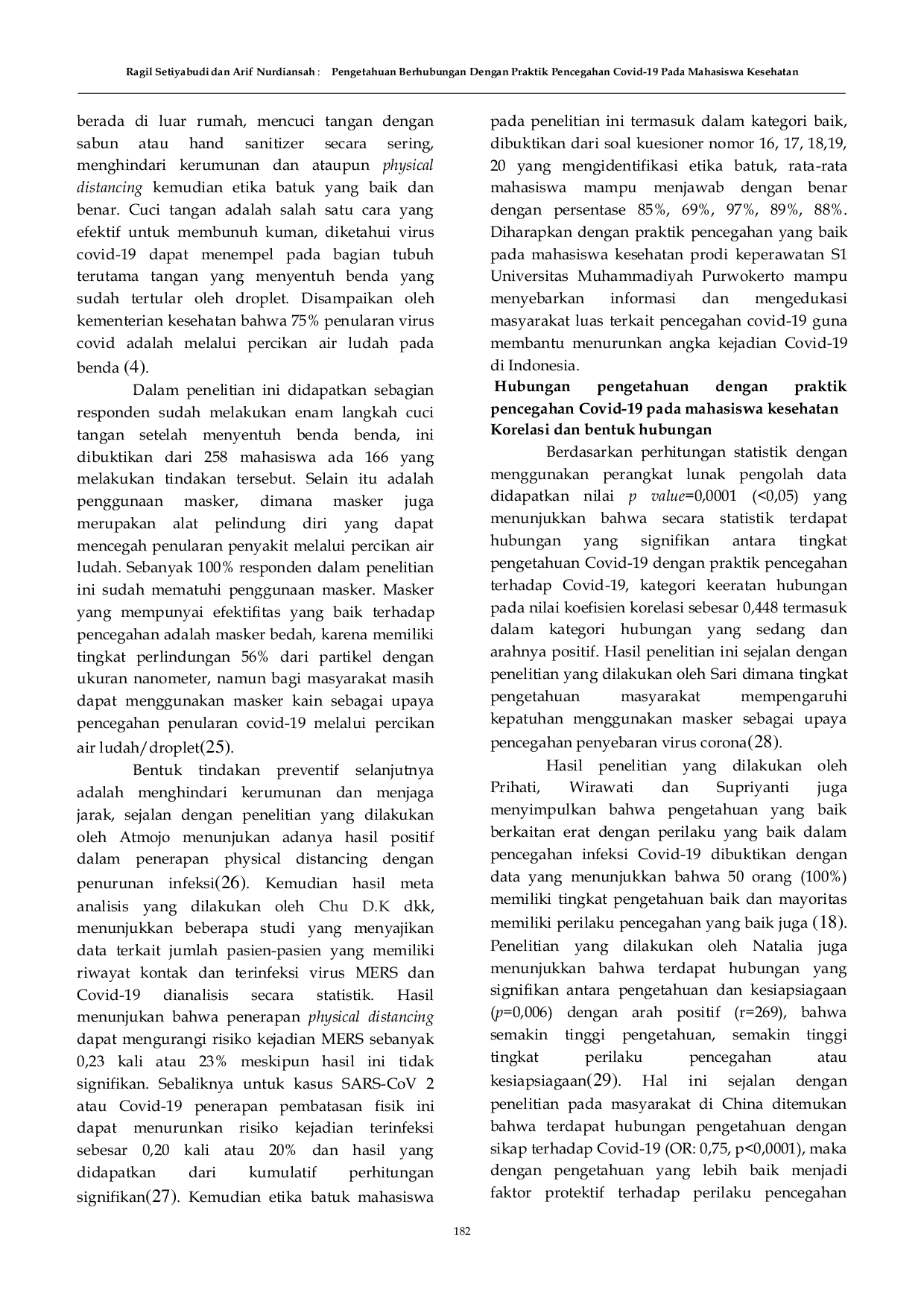An-Nadaa: Jurnal Kesehatan Masyarakat (e-Journal)An-Nadaa: Jurnal Kesehatan Masyarakat (e-Journal)Sampai dengan bulan Juni 2021 Covid-19 masih menjadi masalah kesehatan di berbagai belahan dunia, termasuk negara Indonesia. Sudah berbagai cara dilakukan oleh pemerintah untuk menurunkan kasus Covid-19. Pengetahuan dan praktik pencegahan Covid-19 salah satu yang melatarbelakangi keberhasilan pencegahan Covid-19. Tujuan dalam penelitian ini untuk mengetahui hubungan pengetahuan dengan praktik pencegahan Covid-19 pada mahasiswa Kesehatan. Penelitian ini menggunakan metode kuantitatif dengan pendekatan cross-sectional. Teknik pengambilan sampel menggunakan teknik stratified random sampling, jumlah sampel 258 responden dengan kriteria Mahasiswa Prodi Keperawatan S1 Universitas Muhammadiyah Purwokerto. Hasil penelitian menunjukkan karakteristik jenis kelamin responden sebagian besar berjenis kelamin perempuan 201 (77,3%) dengan jumlah responden didominasi angkatan 2018 sebanyak 102 (32,6%). Hasil uji korelasi produk momen pearson, didapatkan P=0,0001 dan nilai koefisien korelasi 0,448 (berada pada tingkat keeratan sedang) dengan arah hubungan positif. Kesimpulan dalam penelitian terdapat hubungan yang signifikan antara pengetahuan dengan praktik pencegahan Covid-19 pada mahasiswa kesehatan prodi keperawatan S1 angkatan 2017, 2018, 2019.