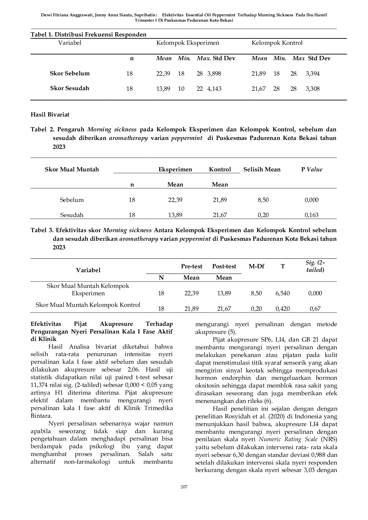An-Nadaa: Jurnal Kesehatan Masyarakat (e-Journal)An-Nadaa: Jurnal Kesehatan Masyarakat (e-Journal)Ketidaknyamanan saat kehamilan banyak terjadi di trimester I, sebanyak 80% ibu hamil mengeluhkan masalah mual atau muntah yang biasa disebut dengan morning sickness. Biasanya masalah ini timbul sekitar 0-16 minggu usia kehamilan atau pada saat ibu hamil memasuki Trimester 1 kehamilannya. Di Puskesmas Padurenan terdapat 25 RW, dengan jumlah ibu hamil 994. Angka rujukan di Puskesmas Padurenan sebesar 120 orang, diagnosa hiperemisis menjadi penyumbang angka rujukan terbanyak yaitu sebesar 50 kasus (41,6%) pada periode Januari – Desember 2022. Pada tahun 2023 periode Januari – Mei keluhan mual muntah pada ibu hamil trimester 1 sebanyak 40 ibu hamil. Penelitian ini ditujukan untuk mengetahui . Desain penelitian ini adalah quasi eksperimental, pre dan post test with Control Group Design. Sampel dalam penelitian ini berjumlah 38 pasien dengan 18 kelompok eksperimen dan 18 kelompok kontrol. Instrumen penelitian menggunakan buku panduan aromaterapi dan kuesioner INVR yang sudah di uji validitas dan reabilitas. Pada penelitian ini didapatkan hasil ada pengaruh pemberian aromatherapy peppermint terhadap morning sickness pada kelompok eksperimen dan kontrol sebelum dan sesudah diberikan intervensi. Pada kelompok eksperimen didapatkan nilai p 0,00 dan untuk kelompok kontrol didapatkan nilai p 0.60.