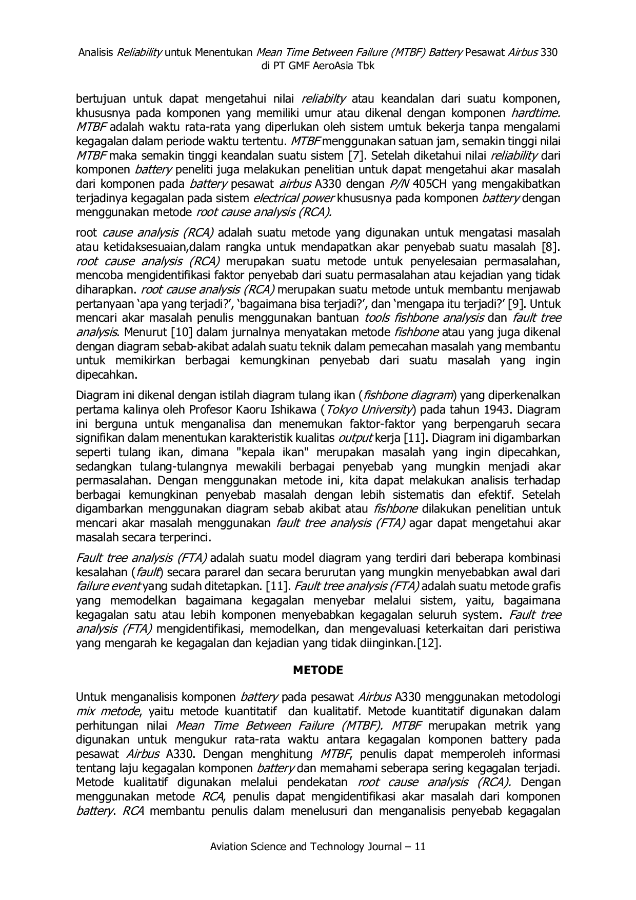 Aviation Science and Technology JournalAviation Science and Technology JournalPenelitian ini membahas masalah kegagalan pada komponen battery pesawat airbus A330 dengan P/N 405CH yang sangat berpengaruh terhadap keselamatan penerbangan. Metode mix metode digunakan untuk menganalisis keandalan dan akar masalah dari komponen battery tersebut. Metode kuantitatif digunakan untuk menghitung mean time between failure (MTBF) dan didapatkan hasil MTBF sebesar 1801,509804 jam untuk komponen battery P/N 405CH pada pesawat airbus A330. Metode kualitatif menggunakan root cause analysis (RCA) dengan bantuan fishbone diagram dan fault tree analysis (FTA) untuk mengidentifikasi faktor penyebab kegagalan. Beberapa faktor yang diidentifikasi antara lain faktor manusia, mesin, metode, dan lingkungan. Untuk mengatasi masalah ini, diperlukan tindakan preventif seperti memberikan training khusus kepada teknisi terkait komponen battery, memantau kondisi lingkungan penyimpanan, dan memastikan prosedur perawatan sesuai dengan CMM. Pengawasan terhadap teknisi junior juga penting untuk memastikan dilakukan dengan baik dan mengurangi risiko kegagalan pada komponen battery.