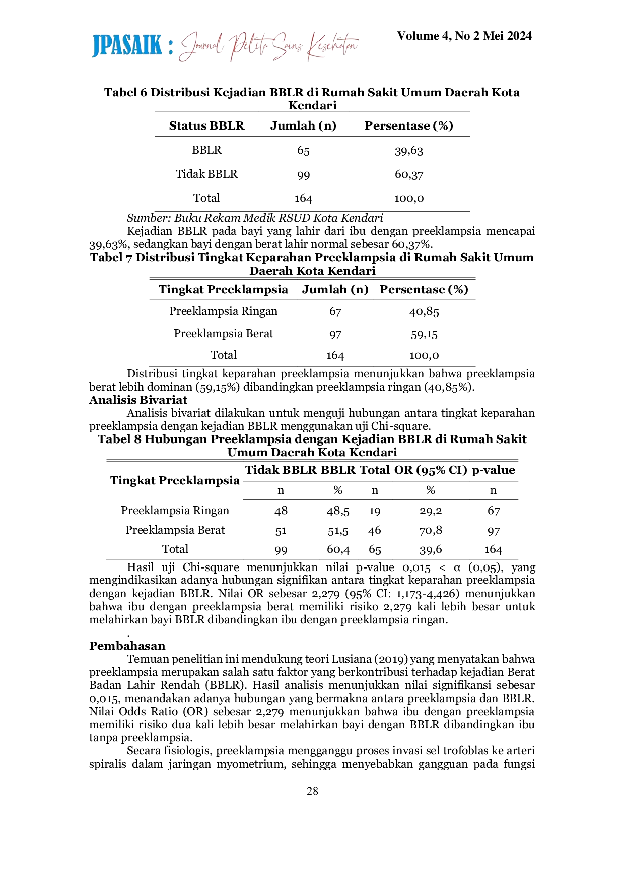 Berdasarkan hasil penelitian dan pembahasan diperoleh uji statistic chi square menunjukkan nilai ρ=0,015<0,05 artinya HO ditolak dan HA diterima yang berarti ada pengaruh umur ibu terhadap kejadian preeklampsia pada ibu bersalin di Rumah Sakit Umum Daerah Kota Kendari.Preeklampsia merupakan faktor risiko yang signifikan terhadap kejadian bayi berat badan lahir rendah (BBLR) pada ibu bersalin di Rumah Sakit Umum Daerah Kota Kendari.Hasil ini menggarisbawahi pentingnya skrining dan penanganan preeklampsia untuk meminimalkan risiko LBW.