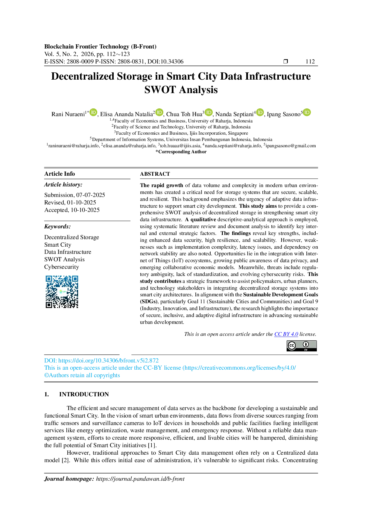Blockchain Frontier TechnologyBlockchain Frontier TechnologyPertumbuhan volume dan kompleksitas data di lingkungan perkotaan modern telah menciptakan kebutuhan mendesak akan sistem penyimpanan yang aman, skalabel, dan tangguh. Latar belakang ini menekankan urgensi infrastruktur data adaptif untuk mendukung pengembangan kota pintar. Penelitian ini bertujuan memberikan analisis SWOT komprehensif mengenai penyimpanan terdesentralisasi dalam penguatan infrastruktur data kota pintar. Pendekatan kualitatif deskriptif-analitis digunakan, melalui tinjauan literatur sistematis dan analisis dokumen untuk mengidentifikasi faktor-faktor strategis internal dan eksternal utama. Temuan menunjukkan kekuatan utama, meliputi keamanan data yang lebih baik, ketahanan tinggi, dan skalabilitas. Namun, kelemahan seperti kompleksitas implementasi, masalah latensi, dan ketergantungan pada stabilitas jaringan juga dicatat. Peluang terdapat pada integrasi dengan ekosistem Internet of Things (IoT), peningkatan kesadaran publik terhadap privasi data, serta model ekonomi kolaboratif yang muncul. Sementara itu, ancaman meliputi ambiguitas regulasi, kurangnya standarisasi, dan risiko keamanan siber yang terus berkembang. Penelitian ini memberikan kerangka strategis untuk membantu pembuat kebijakan, perencana kota, dan pemangku kepentingan teknologi dalam mengintegrasikan sistem penyimpanan terdesentralisasi ke dalam arsitektur kota pintar. Selaras dengan Tujuan Pembangunan Berkelanjutan (SDGs), khususnya Tujuan 11 (Kota Berkelanjutan dan Masyarakat) dan Tujuan 9 (Industri, Inovasi, dan Infrastruktur), penelitian ini menyoroti pentingnya infrastruktur digital yang aman, inklusif, dan adaptif dalam memajukan pembangunan perkotaan yang berkelanjutan.