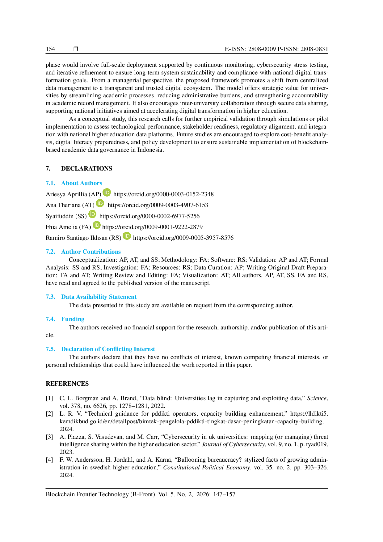 Blockchain Frontier TechnologyBlockchain Frontier TechnologyPengelolaan data mahasiswa di perguruan tinggi Indonesia terus menghadapi tantangan seperti duplikasi data, manipulasi catatan akademik, transparansi terbatas, dan interoperabilitas lemah yang disebabkan oleh basis data terpusat. Masalah-masalah ini menghambat kredibilitas institusi, efisiensi administratif, dan tata kelola akademik yang terpercaya. Penelitian ini bertujuan untuk mengembangkan secara konseptual kerangka kerja berbasis blockchain guna meningkatkan integritas data, transparansi, dan efisiensi dalam pengelolaan data mahasiswa. Menggunakan pendekatan deskriptif kualitatif dan komparatif, penelitian ini menganalisis model blockchain yang ada serta mengintegrasikan perspektif teknologi dan manajemen untuk merancang sistem blockchain berizin yang didukung oleh kontrak cerdas. Kerangka kerja yang diusulkan berfokus pada otomatisasi validasi data akademik, penguatan kontrol akses, serta memungkinkan pertukaran data antar institusi secara aman. Temuan komparatif menunjukkan bahwa blockchain menawarkan sifat tidak dapat diubah, dapat dilacak, dan akuntabel, sehingga menempatkannya sebagai inovasi transformatif dalam tata kelola akademik. Penelitian ini memberikan dasar konseptual bagi perguruan tinggi dan pembuat kebijakan untuk mengadopsi sistem data akademik berbasis blockchain yang aman dan interoperabel sesuai dengan agenda transformasi digital Indonesia di perguruan tinggi. Disarankan agar penelitian lanjutan mensimulasi atau menguji coba model ini untuk evaluasi dan implementasi praktis.