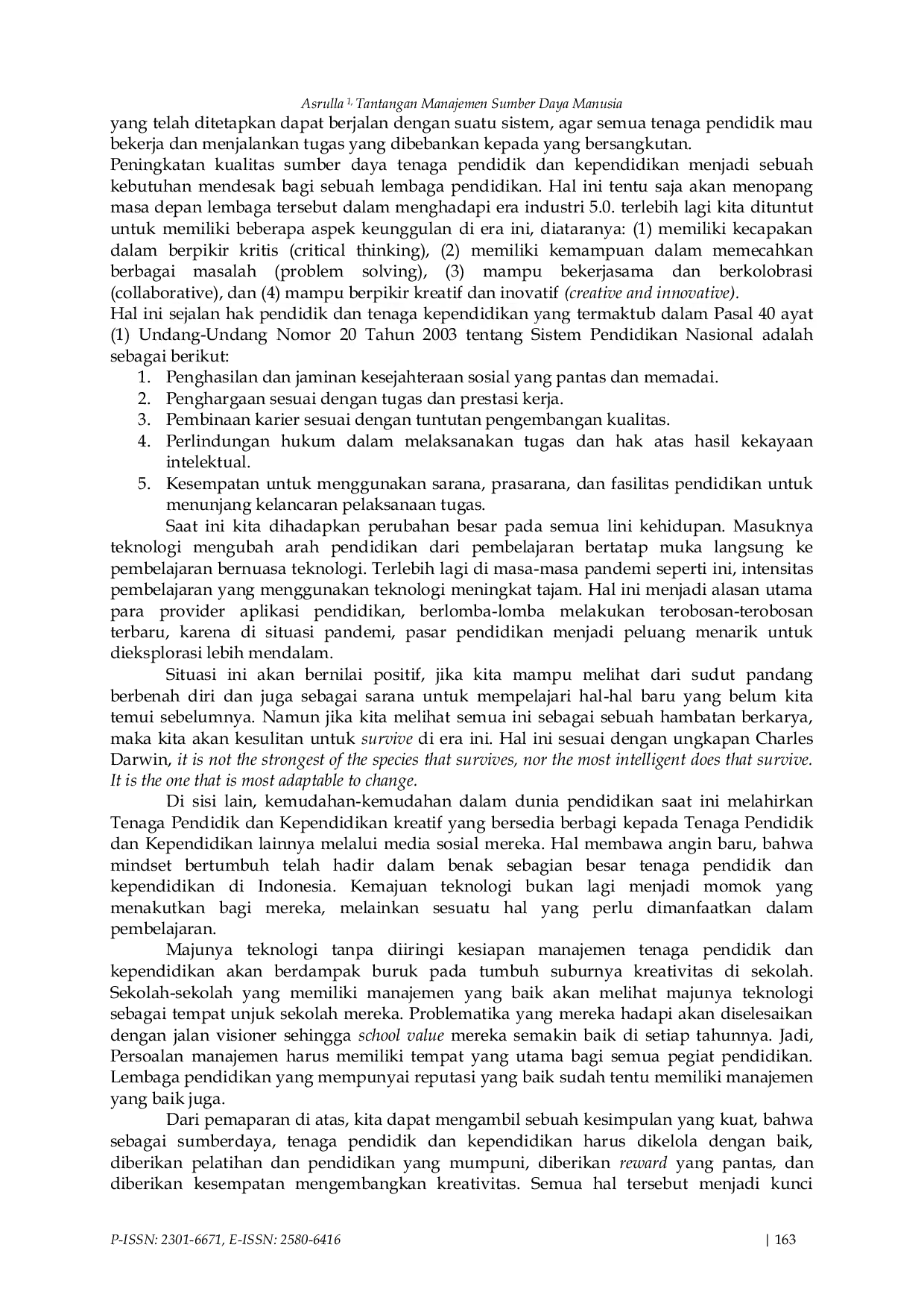 Jurnal Genta MuliaJurnal Genta MuliaSalah satu sumber daya yang penting dalam manajemen pendidikan islam adalah sumber daya manusia. Pentingnya sumber daya manusia ini perlu disadari oleh semua pihak bahwa kualitas mutu pendidik akan sangat menopong keberhasilan manajemen sebuah sekolah. Bagaimanapun majunya teknologi yang begitu pesat menjadi tantangan yang cukup sulit di dunia pendidikan, namun faktor pendidik yang berkualitas akan tetap memegang peranan penting bagi keberhasilan suatu organisasi sekolah. Bahkan dengan kemajuan teknologi yang pesat akan berjalan beriringan dengan peningkatan kualitas pendidik yang menjadi pelopor kemajuan pendidikan itu sendiri. Dalam lembaga pendidikan manajemen sumber daya manusia adalah hal yang sangat penting untuk diterapkan. Tanpa manajemen sumber daya manusia yang baik, suatu organisasi pada umumnya akan kesulitan dalam mencapai tujuannya, begitu pula dalam lembaga pendidikan. Manajemen sumber daya manusia merupakan unsur terpenting dalam manajemen karena sumber daya manusia merupakan unsur pertama dalam manajemen sebelum unsur‑unsur lainnya. Peranan manajemen sumber daya manusia dalam lembaga pendidikan tentu sangat berkontribusi dalam membantu meningkatkan mutu pendidikan, karena pendidikan yang bermutu berasal dari orang‑orang berkualitas yang mengelola pendidikan itu sendiri. Namun dalam perjalanan manajemen sumber daya manusia dalam pendidikan memiliki begitu banyak tantangan yang harus diberika solusi konkret sehingga terjadi pengembangan sumber daya manusia yang lebih efektif yang berimplikasi pada kondisi para pendidik mampu beradaptasinya dengan perkembangan zaman yang begitu pesat.