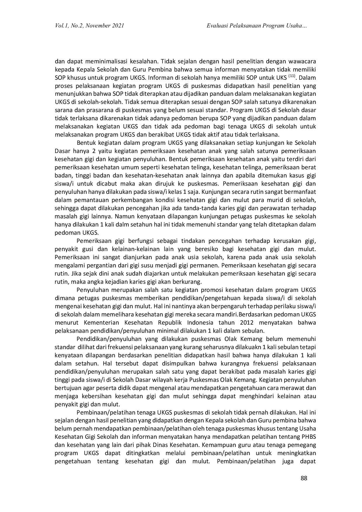 JURNAL ILMU DAN TEKNOLOGI KESEHATAN TERPADUJURNAL ILMU DAN TEKNOLOGI KESEHATAN TERPADUPrevalensi yang mengalami masalah karies gigi di Kota Jambi sebesar 0,74%. Dan jumlah kasus per kelurahan yang mengalami masalah karies gigi tertinggi terjadi di Puskesmas Olak Kemang Kota Jambi yakni sebesar 6,81%. Karies gigi merupakan salah satu masalah kesehatan masyarakat yang serius, oleh sebab itu diperlukan keterlibatan keluarga dan sekolah untuk mengatasinya. Terdapat beberapa kendala dalam pelaksanaan program UKGS di wilayah kerja Puskesmas Olak Kemang Kota Jambi diantarannya SDM di sekolah yang tidak sesuai standar, sarana dan prasarana kurang memadai, anggaran dana yang minim. Penelitian ini menggunakakn metode penelitian kualitatif dengan rancangan studi kasus. Pengumpulan data melalui metode wawancara mendalam, Focus Group Discussion (FGD), observasi dan dokumentasi. Pemeriksaan keabsahan data memanfaatkan teknik triangulasi sumber dan metode. Hasil evaluasi program UKGS menunjukkan bahwa beberapa aspek input belum memenuhi standar, yaitu terdiri dari tenaga pelaksana UKGS di sekolah, anggara dana, sarana dan prasarana dan ketersediaan SOP di sekolah. Proses meliputi kegiatan program UKGS yang dilaksanakan hanya pendidikan atau penyuluhan dan pemeriksaan gigi dan mulut, untuk pembinaan/pelatihan tenaga pelaksana UKGS, kegiatan sikat gigi massal tidak pernah dilaksanakan. Output dalam kegiatan program UKGS adalah pengetahuan siswa dan siswi tentang UKGS dan kesehatan gigi dan mulut sangat kurang baik. Pelaksanaan program UKGS di wilayah kerja Puskesmas Olak Kemang belum maksimal, yang berakibat pada kurang optimalnya kinerja pelaksana UKGS.