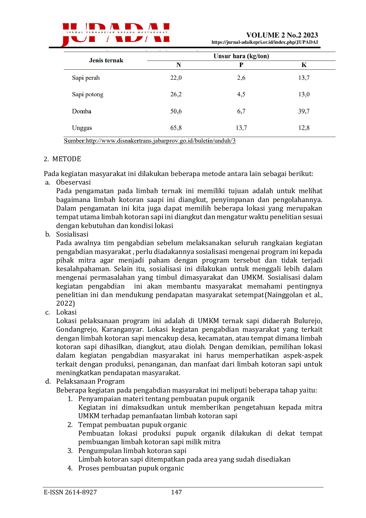 - Jurnal Warta Desa (JWD). pemanfaatan kotoran sapi pupuk organik batukliang lombok jurnal jwd authors... jwd.unram.ac.id/index.php/jwd/article/view/25Jurnal Warta Desa JWD pemanfaatan kotoran sapi pupuk organik batukliang lombok jurnal jwd authors jwd unram ac index php jwd article view 25