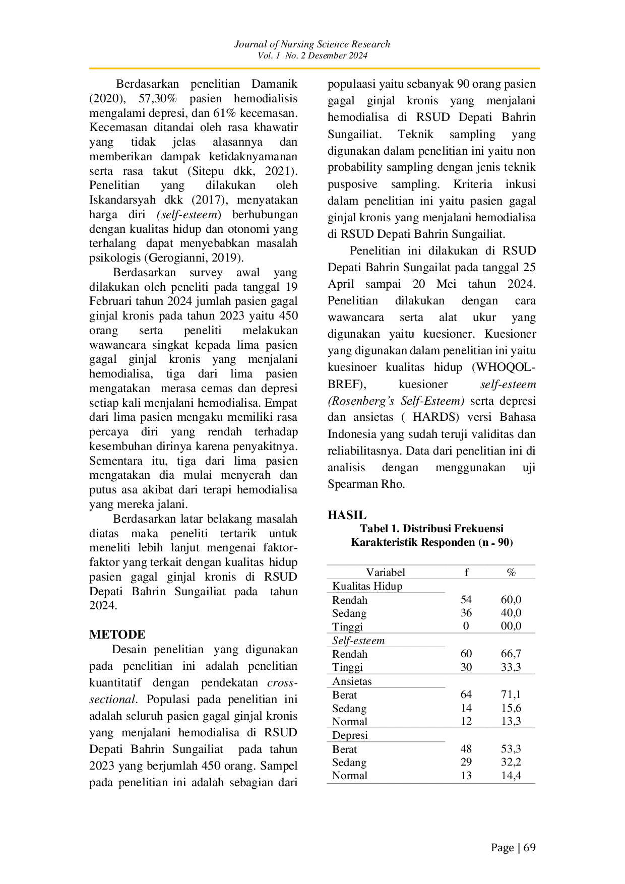 Journal Of Nursing Science ResearchJournal Of Nursing Science ResearchPasien yang menderita gagal ginjal kronis dan menjalani hemodialisa akan mengalami gangguan dalam berbagai aspek kehidupannya, termasuk fisik, psikologis, sosial, dan lingkungan yang pada akhirnya akan mempengaruhi kualitas hidupnya. Penelitian ini bertujuan untuk mengetahui faktor-faktor yang berhubungan dengan kualitas hidup pasien gagal ginjal kronis yang menjalani hemodialisa.