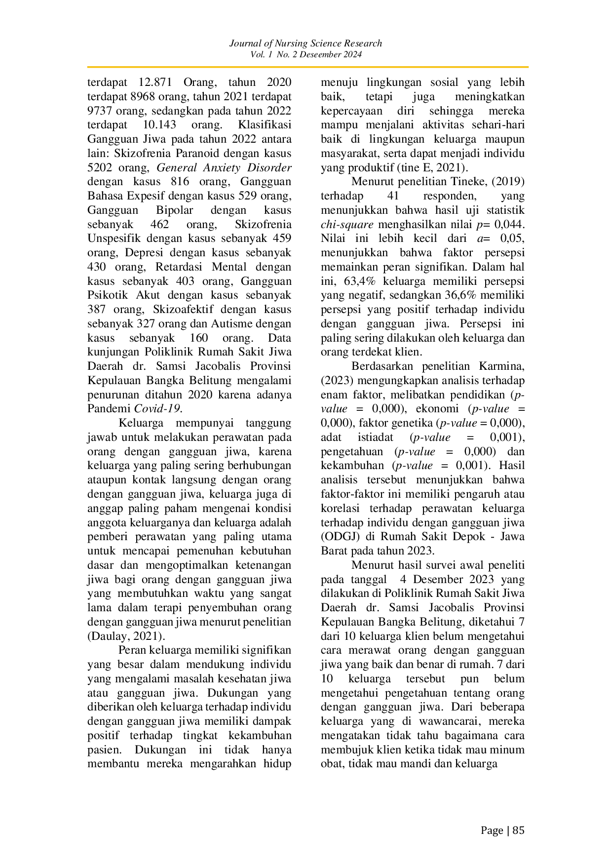 Tingkat pendidikan, tingkat ekonomi, genetik, dan pengetahuan memiliki hubungan yang signifikan dengan perawatan keluarga terhadap orang dengan gangguan jiwa di Poliklinik Rumah Sakit Jiwa Daerah dr.Samsi Jacobalis Provinsi Kepulauan Bangka Belitung Tahun 2024.Keluarga dengan pendidikan dan ekonomi lebih tinggi cenderung memberikan perawatan yang lebih baik.Selain itu, keluarga dengan riwayat genetik gangguan jiwa dan pengetahuan yang memadai juga lebih mampu memberikan perawatan secara optimal.