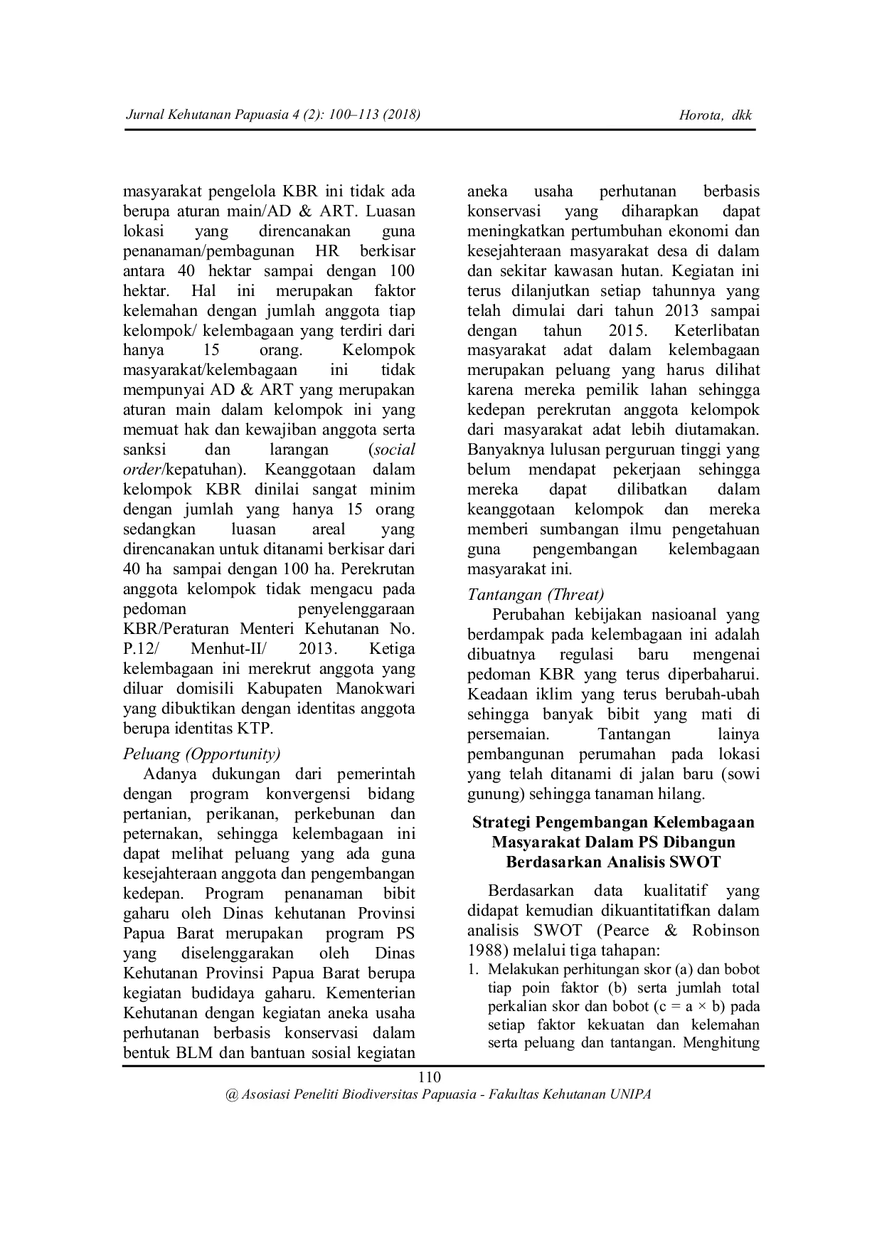 JURNAL KEHUTANAN PAPUASIAJURNAL KEHUTANAN PAPUASIAPenelitian ini bertujuan untuk menilai peran dan fungsi kelembagaan masyarakat yang terlibat dalam program-program PS yang sudah dan atau sedang dijalankan di Kabupaten Manokwari. Pendekatan metode yang digunakan yakni metode studi kasus, yang mana sebagai kasus dalam penelitian ini adalah peran dan fungsi anggota kelompok dalam pengembangan program PS. Responden yang diwawancarai dalam penelitian ini terdiri dari responden kunci adalah setiap ketua kelompok dalam lembaga dan pendamping kegiatan dari instansi terkait. Hasil penelitian menunjukkan bahwa terdapat tiga kelompok kebun rakyat di tiga lokasi yang berbeda yaitu: kelompok Ofoncu Efeina (Kelurahan Amban), Udopi (Kampung Masepi) dan Sarina (Kampung Sarina). Penggunaan areal untuk membangun areal pembibitan dilakukan pada hak milik anggota kelompok. Keterlibatan stakeholder sangat berperan dalam mendukung realisasi kegiatan PS yang cukup efektif. Hasil evaluasi kelembagaan masyarakat yang melaksanakan program PS pembuatan kebun bibit rakyat di Kabupaten Manokwari dinilai sangat lemah dan menghadapi tantangan besar namun disisi lain peluang dari luar sangat besar jika kelembagaan masyarakat dapat ditata dan dikembangkan.