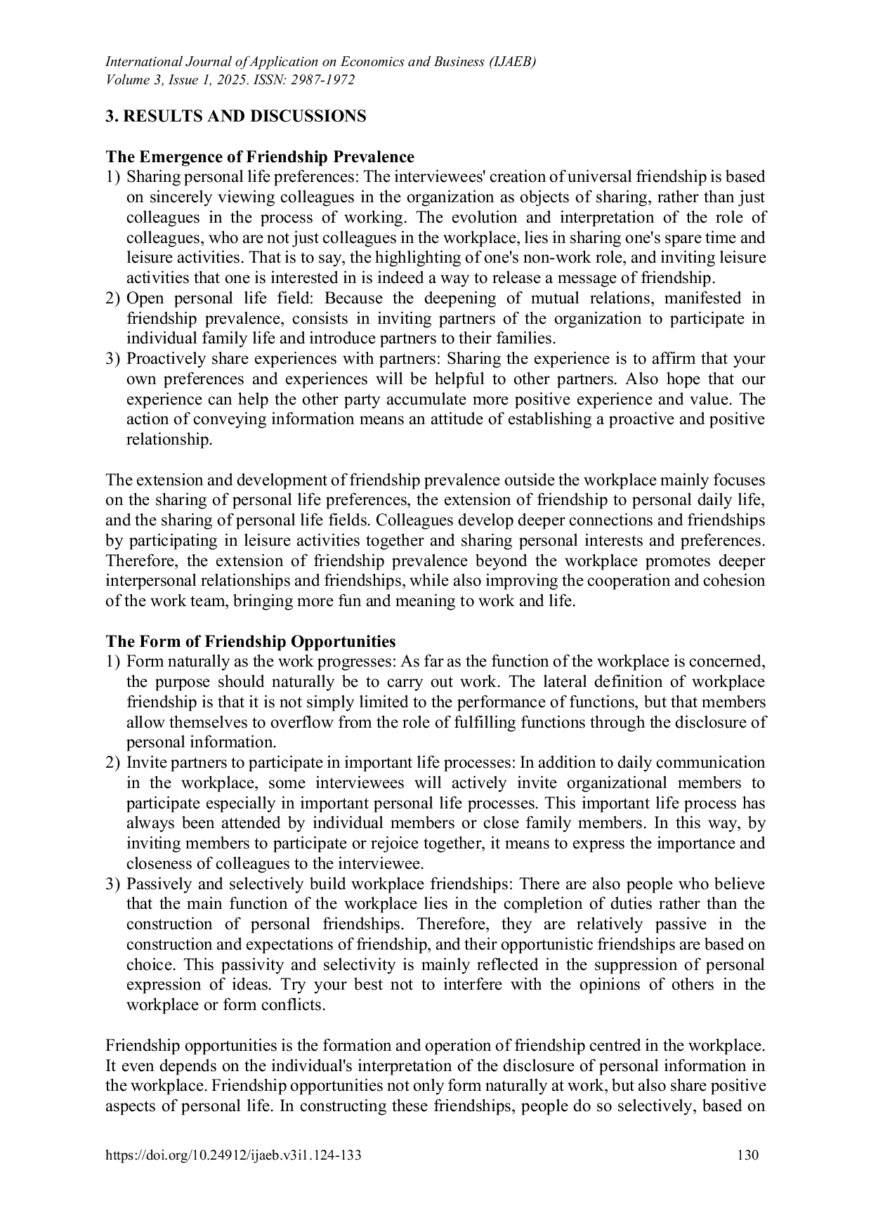 International Journal of Application on Economics and BusinessInternational Journal of Application on Economics and BusinessDalam lingkungan kompetitif yang berubah dengan cepat, menarik perusahaan-perusahaan kooperatif untuk memaksimalkan keuntungan dan menciptakan situasi *win-win* menyoroti nilai persahabatan di tempat kerja dalam kemitraan perusahaan. Penelitian ini menyelidiki bagaimana dua perusahaan (pembangkit listrik S dan perusahaan kontraktor C) dapat mengatasi perbedaan dan mencapai tujuan ko-kreasi nilai karena peningkatan persahabatan di tempat kerja meskipun terdapat perbedaan dalam budaya perusahaan, kognisi bisnis, dan pemahaman operasi praktis. Dalam penelitian ini, wawancara mendalam dilakukan terhadap personel manajemen pembangkit listrik S, penanggung jawab perusahaan C, dan tenaga kerja kontrak. Dua kesimpulan penelitian diperoleh: (1) Perekrutan personel berfungsi sebagai saluran dialog, memulai ko-kreasi nilai bagi kedua belah pihak; (2) Hanya ketika kedua belah pihak bersama-sama menciptakan gaya sentripetal, kohesi, dan reputasi, mereka dapat bersama-sama melakukan ko-kreasi nilai. Saran juga diberikan masing-masing kepada manajemen sumber daya manusia pembangkit listrik S berdasarkan observasi praktik penelitian.