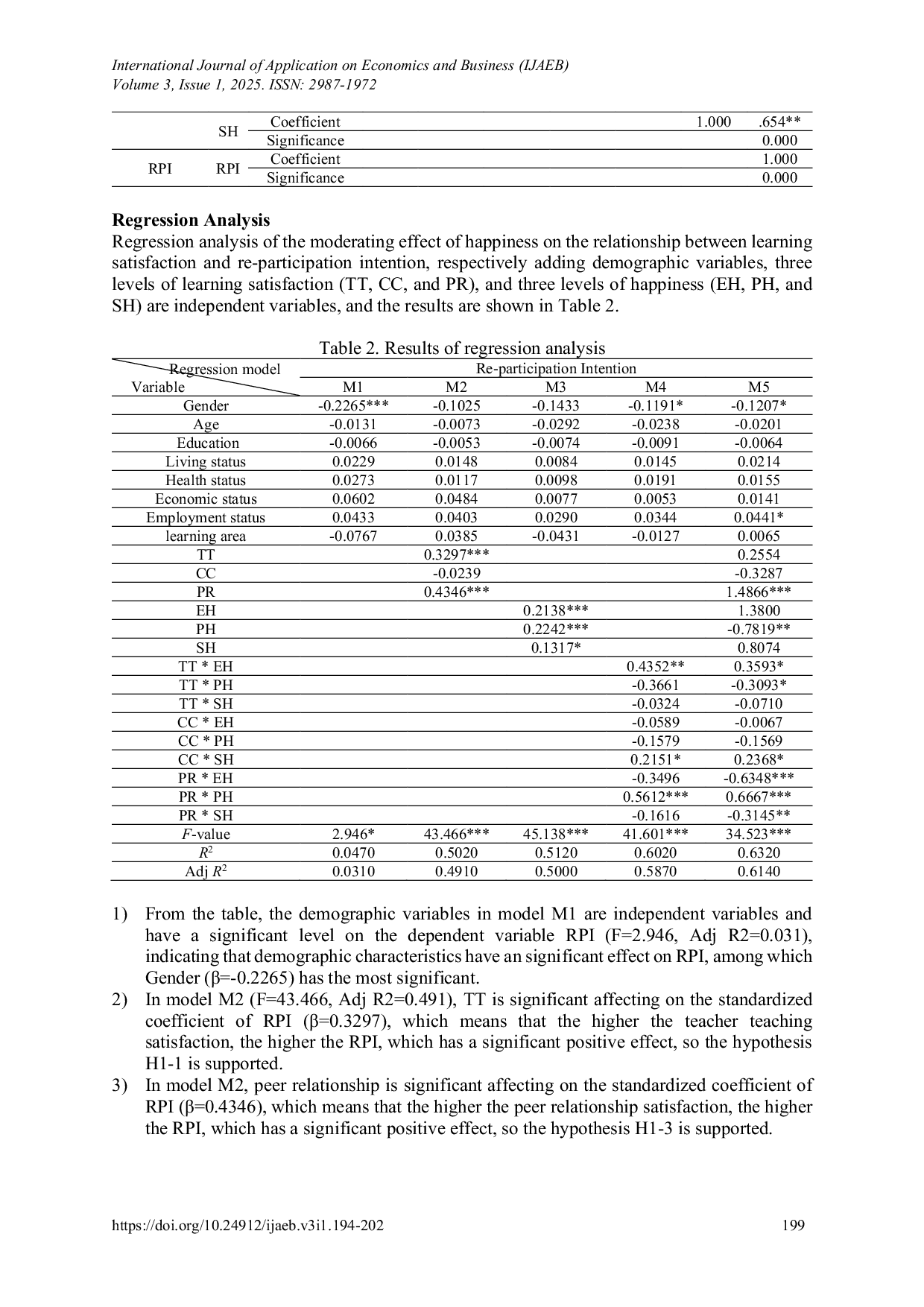 International Journal of Application on Economics and BusinessInternational Journal of Application on Economics and BusinessThe present study aims to investigate the relationship between learning satisfaction and re-participation intention of senior learning, and use happiness as a moderator. A questionnaire survey was conducted in Tainan city, testing learners aged 55 and above. A total of 486 valid questionnaires were received from an initial 521 distributed. The results indicated a positive effect between happiness and re-participation intention; specifically, higher psychological and emotional happiness among senior learners correlated with a greater intention to re-participate. The study suggests that improving seniors sense of happiness can enhance the promoting effect of course satisfaction on re-participation intention. Therefore, training institutions should focus not only on course quality and teaching effects but also on improving learners happiness to encourage continued participation in learning activities, ultimately improving their overall quality of life.